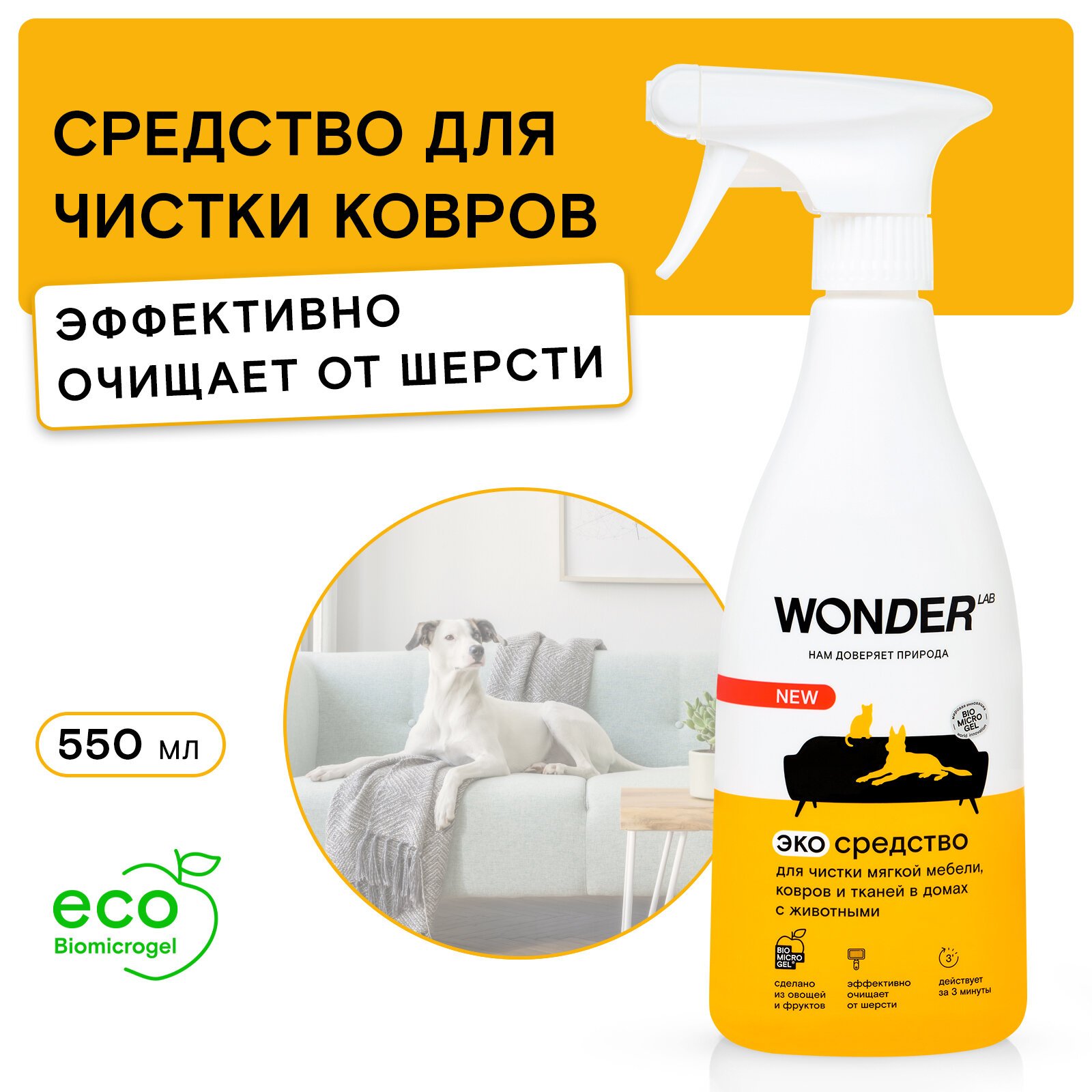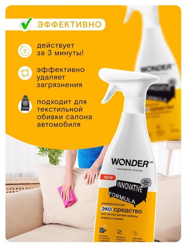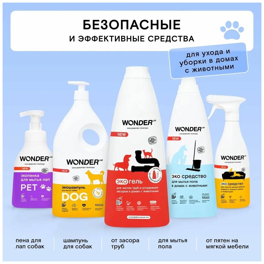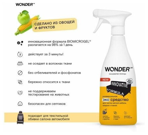 Чистящее средство Wonder Lab для удаления пятен от животных на мягкой мебели, коврах, матрасах, лежанках и любых типах тканей. Деликатное, но эффективное экосредство от Wonder Lab очищает любые типы загрязнений после животного, не вредит структуре ткани и не оседает в волокнах. Чистящее средство не имеет резкого запаха, не раздражая даже самых чувствительных. Благодаря удобному формату спрея, средство экономично расходуется и наносится точечно на загрязнения. Чистящие средства Wonder Lab не содержат токсичных компонентов, опасных для природы или человека. И всё это благодаря инновационному компоненту Biomicrogel, который сделан из овощей и фруктов. Средства Wonder Lab не вредят окружающей среде, не содержат токсичных компонентов и разлагаются на 98% за 1 день.