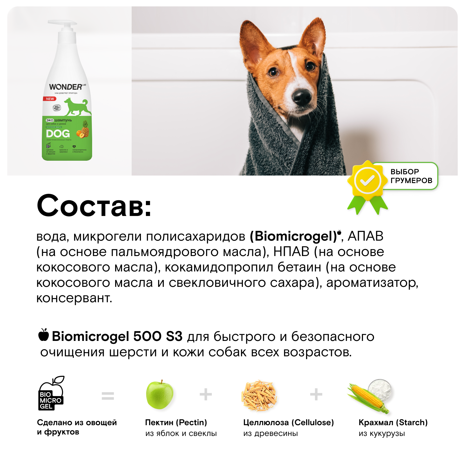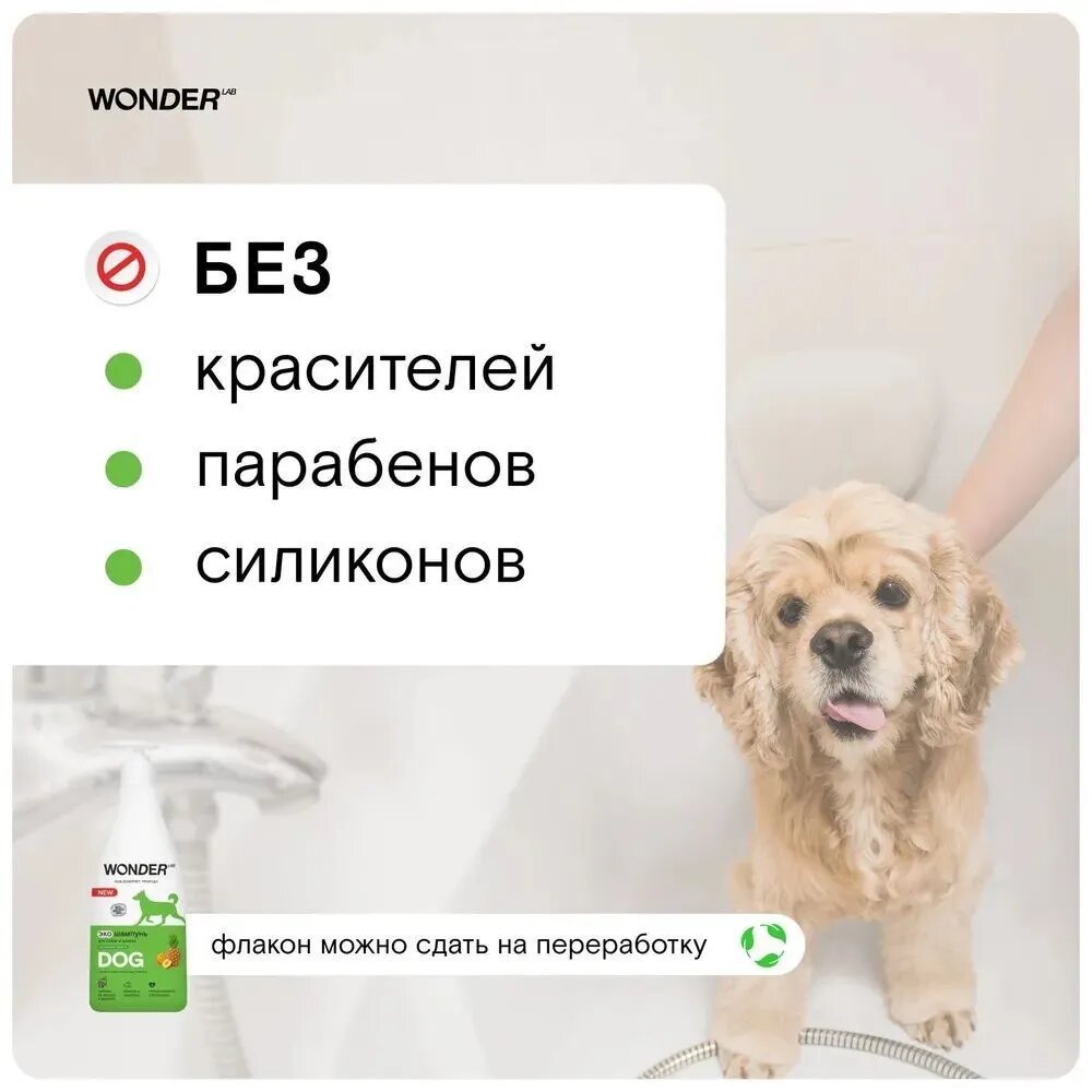 Гипоаллергенный шампунь подходит для собак любых пород и безопасен для щенков. Средство предотвращает спутывание шерсти и эффективно удаляет загрязнения после веселых прогулок в любую погоду. Благодаря отсутствию лишних ароматов, шампунь не будет раздражать вашего любимца и не будет провоцировать аллергию. Экономичный расход и удобный дозатор. В составе экошампуня нет красителей, отдушек и щелочного мыла. После мытья экошампунем, шерсть приобретает здоровый блеск и хорошо расчесывается. Средством можно мыть и лапы животного после прогулки. Шампунь не оставляет посторонних запахов на шерсти собаки, полностью смывается, что безопасно для животного при вылизывании после купания. Экошампунь wonder lab одобрен профессиональными грумерами. Экосредства wonder lab созданы на основе инновационного компонента Biomicrogel, который сделан из овощей и фруктов. Средства wonder lab не вредят окружающей среде, не содержат опасных компонентов и разлагаются на 98% за 1 день.