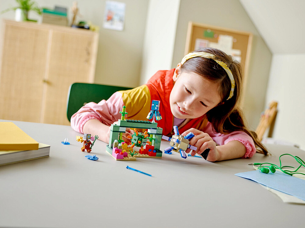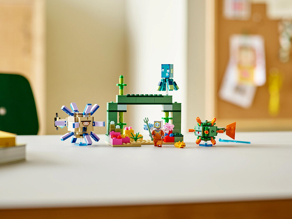 В этом увлекательном подводном приключении Minecraft детей ждет множество испытаний. Первым делом они должны построить монумент на красочном коралловом рифе. Там их ждут спрятанные сокровища, а также два знакомых моба из Minecraft: страж и старший страж. Враги намерены помешать им, но дети, вооружившись трезубцем и заручившись помощью трех аксолотлей, должны отбиться от противников и продолжить свою экспедицию. Дополнительная опасность исходит от шутера с пружинным механизмом, который выстреливает лазерной ракетой по щелчку хвоста старшего стража. Это приключение из кубиков LEGO с бесконечными возможностями для творческой игры открывает для детей захватывающее веселье игры в Minecraft.