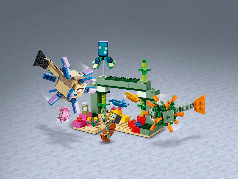 Аутентичные приключения — на сборном коралловом рифе и монументе вы встретитесь со знакомыми персонажами из Minecraft: дайвером, светящимся кальмаром, стражем, старшим стражем и тремя аксолотлями.