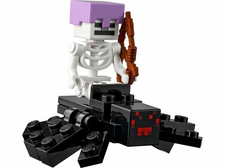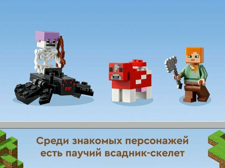 Аутентичные детали — в набор входят знаменитые персонажи Minecraft Алекс, грибная корова и паучий всадник, а также крутые элементы и забавные аксессуары из популярной игры.