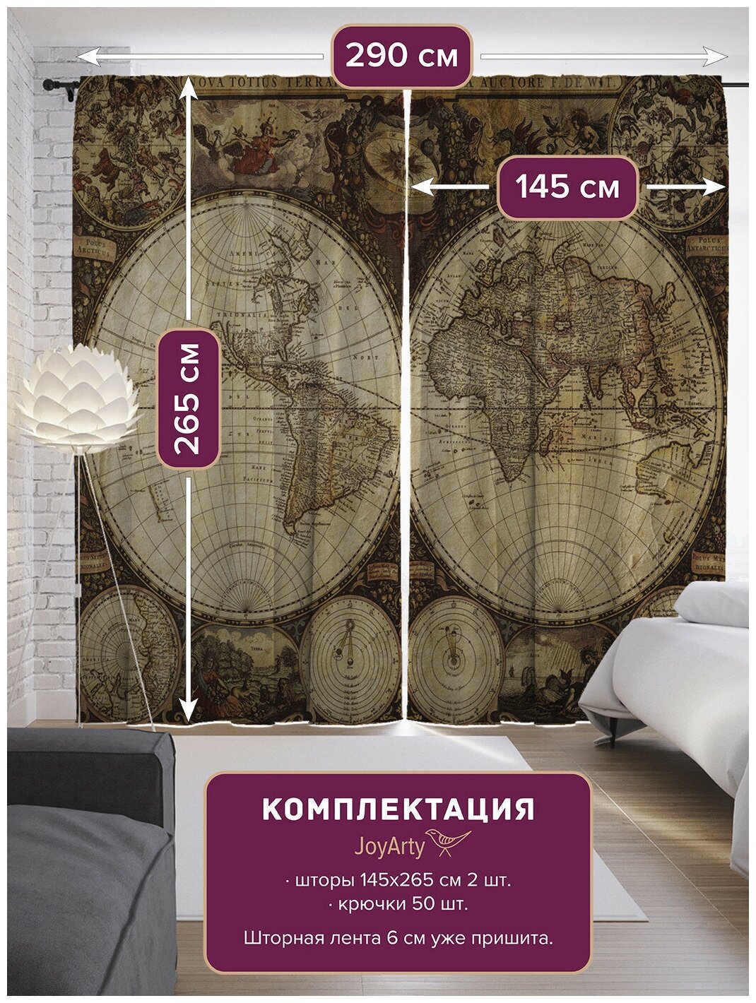 Шторы с фотопечатью "Древняя география" из сатена 290х265 см JoyArty Шторы с фотопечатью Древняя география из сатена 290х265 см