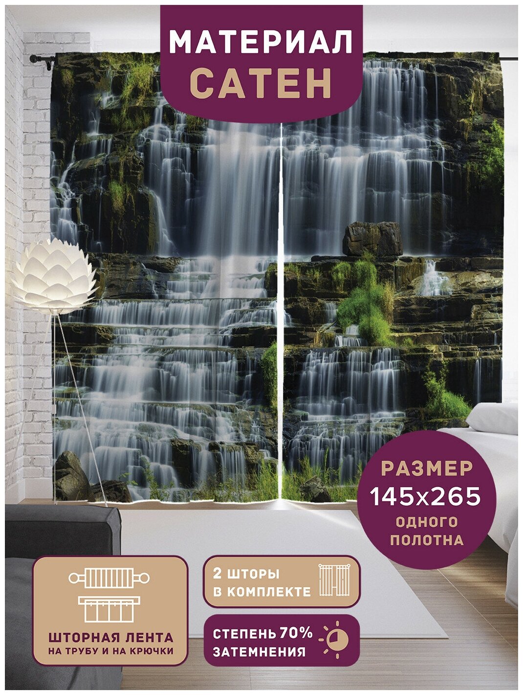 Модель: Шторы с фотопечатью Ступенчатый длинный водопад из сатена 290х265 см