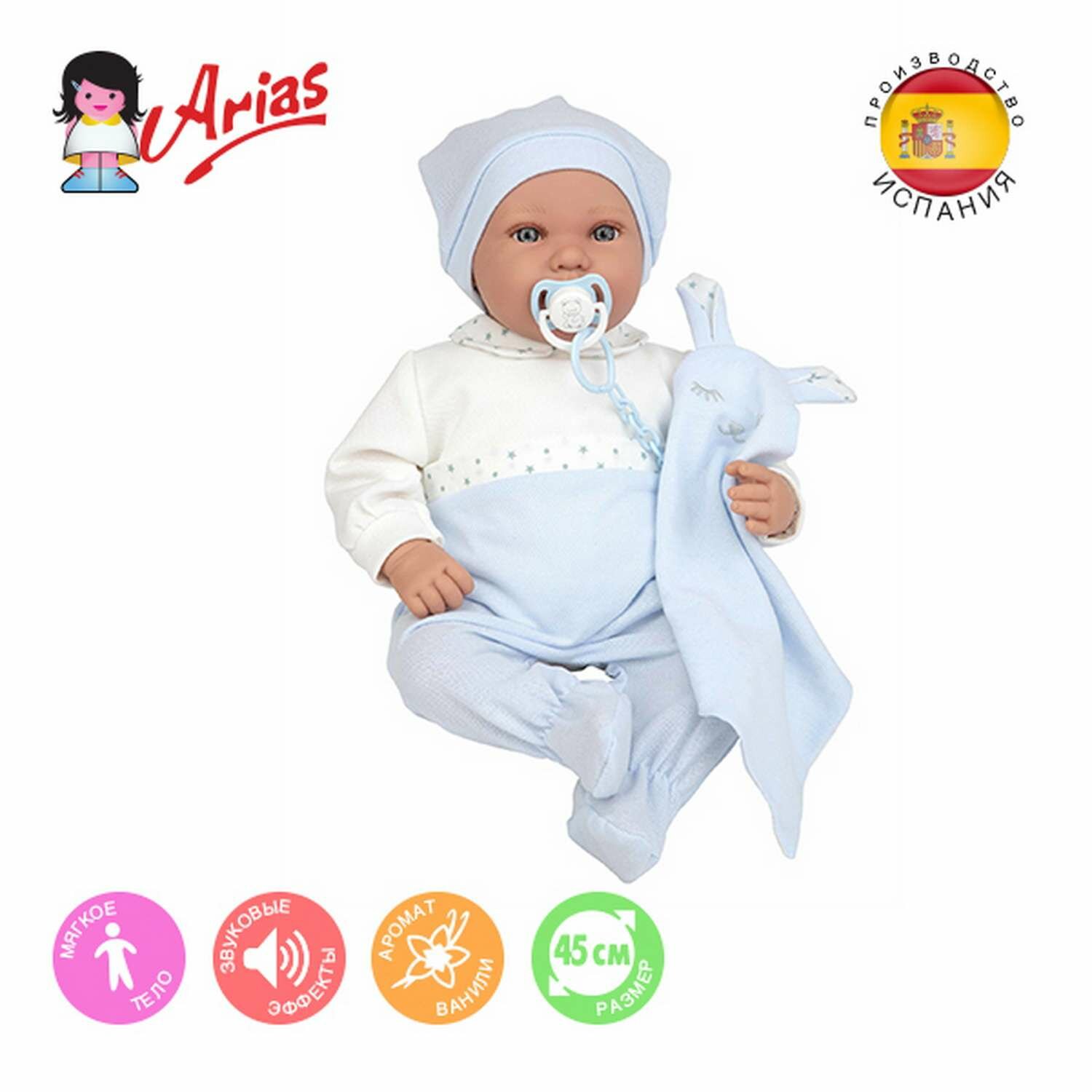 Эта прекрасная кукла Arias создана лучшими дизайнерами Испании из премиальных материалов специально для того, чтобы ваш ребенок мог полюбить ее и играть с ней массой разных способов, придумывая роли и сюжеты. Кукла выглядит очень реалистично и издает звуки, как настоящий ребенок. Если вынуть соску, малыш заплачет. Опыт игры с такой куклой научит вашего ребенка заботе и нежности.