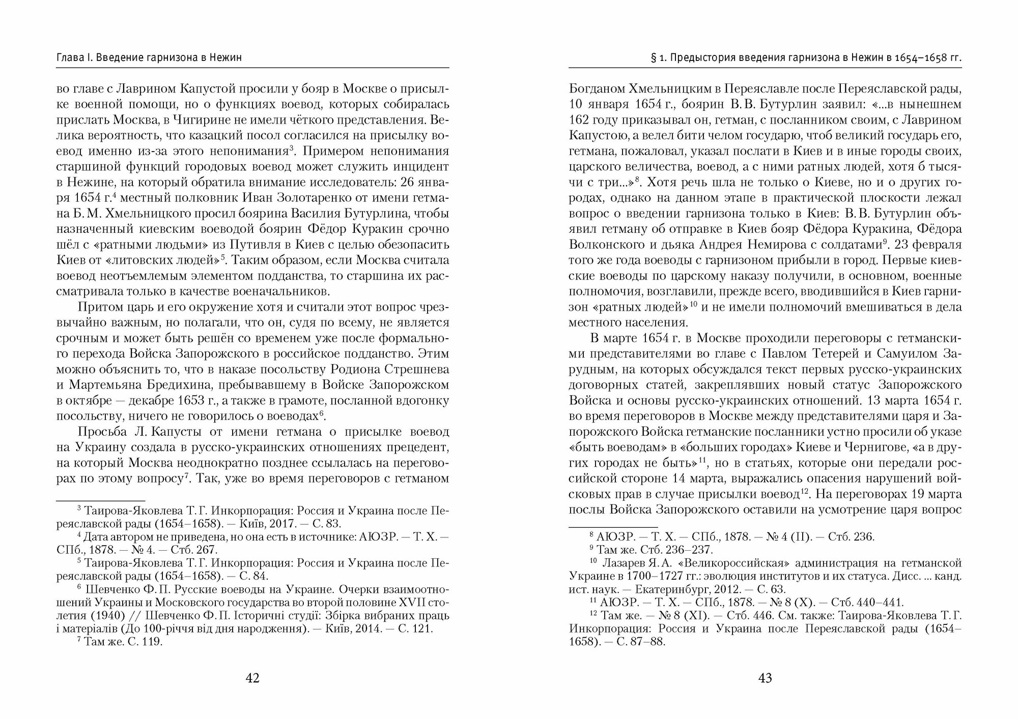В книге рассматриваются отношения русского гарнизона "ратных людей" в Нежине с местными украинскими казаками, мещанами и духовенством в период от его введения в нежинский замок в разных сферах: в судебной, экономической, военной, духовной, демографической и повседневной. Отдельное внимание уделено обстоятельствам и причинам введения гарнизона в замок. Кроме того, в работе показано внутреннее положение гарнизона в этот период, в том числе борьба нежинских стрельцов за свои права.