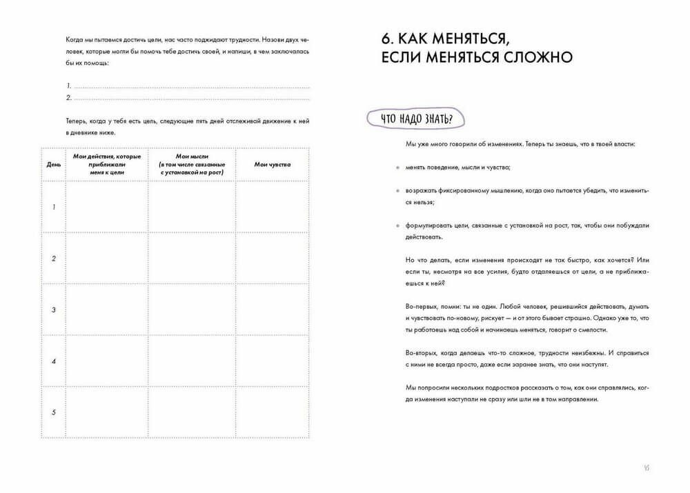В книге есть задания, где авторы просят читателя помочь сформулировать цели для других ребят-подростков. И таких примеров в книге достаточно для того, чтобы читатель смог потренировать свой мозг и начать думать по-другому. И уже решая свои проблемы, подростку будет легко сформулировать цели, заметить установку на данность и установку на рост, научиться действовать в соответствии с установкой на рост.