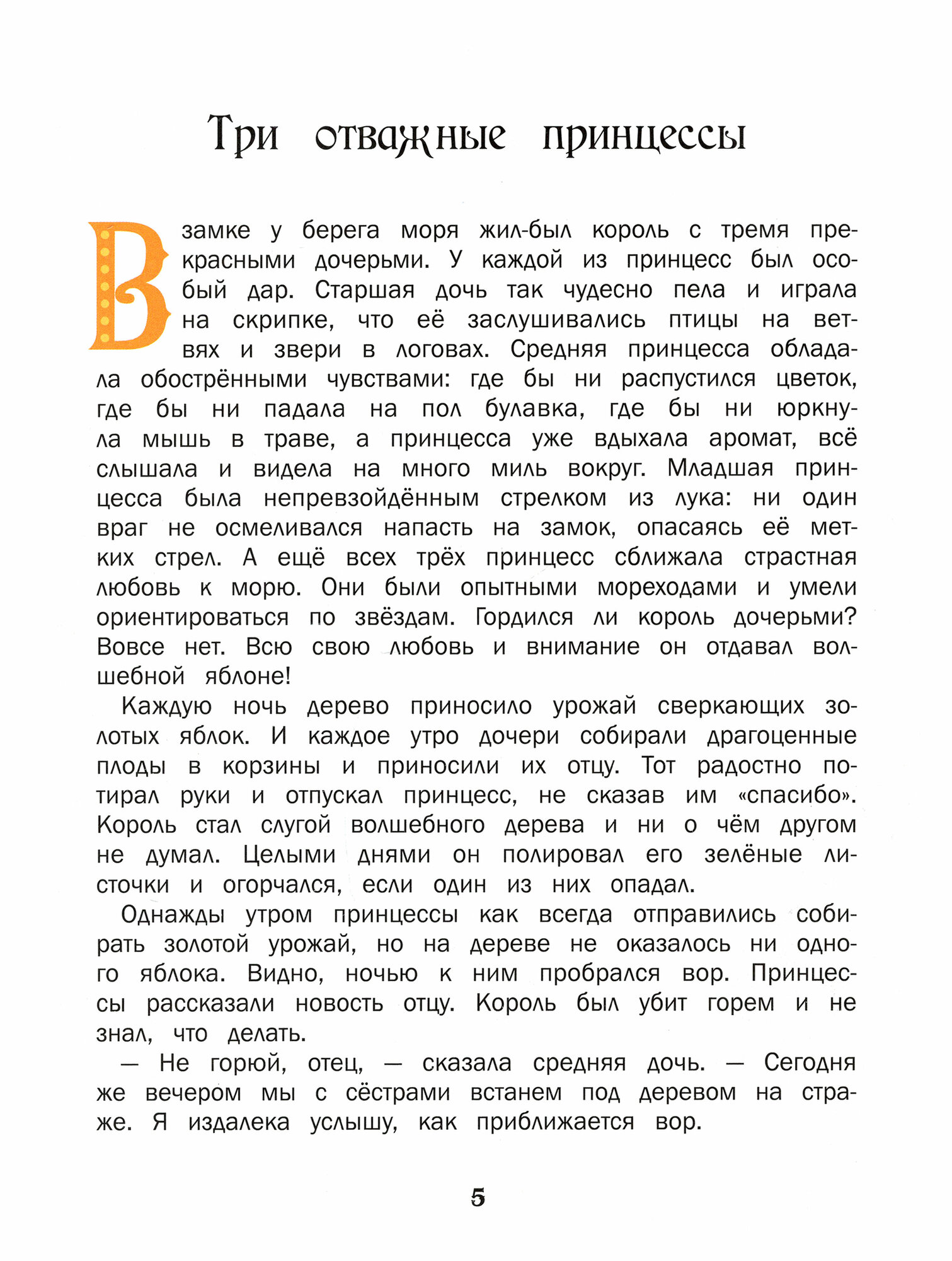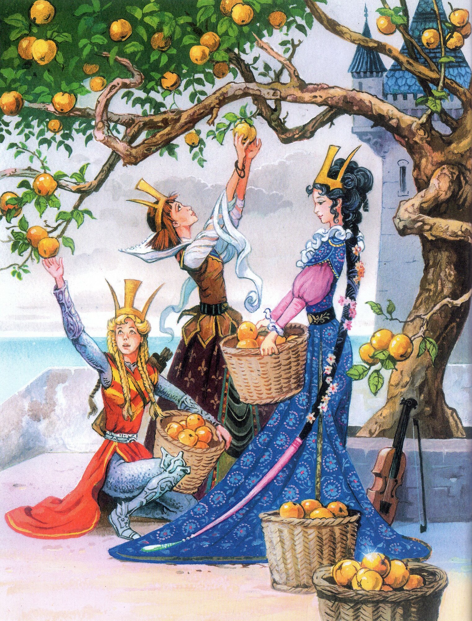 Сюжет этой сказки немного напоминает знакомую нам историю о молодильных яблоках, но только в совершенно другой интерпретации. Яблоки здесь не молодильные, а золотые. Вором оказывается совсем не Жар-Птица, а спасать короля отправляются не сыновья, а дочери! И в конце книги король делает важный вывод: любовь к дочерям намного важнее, чем любовь к золоту.