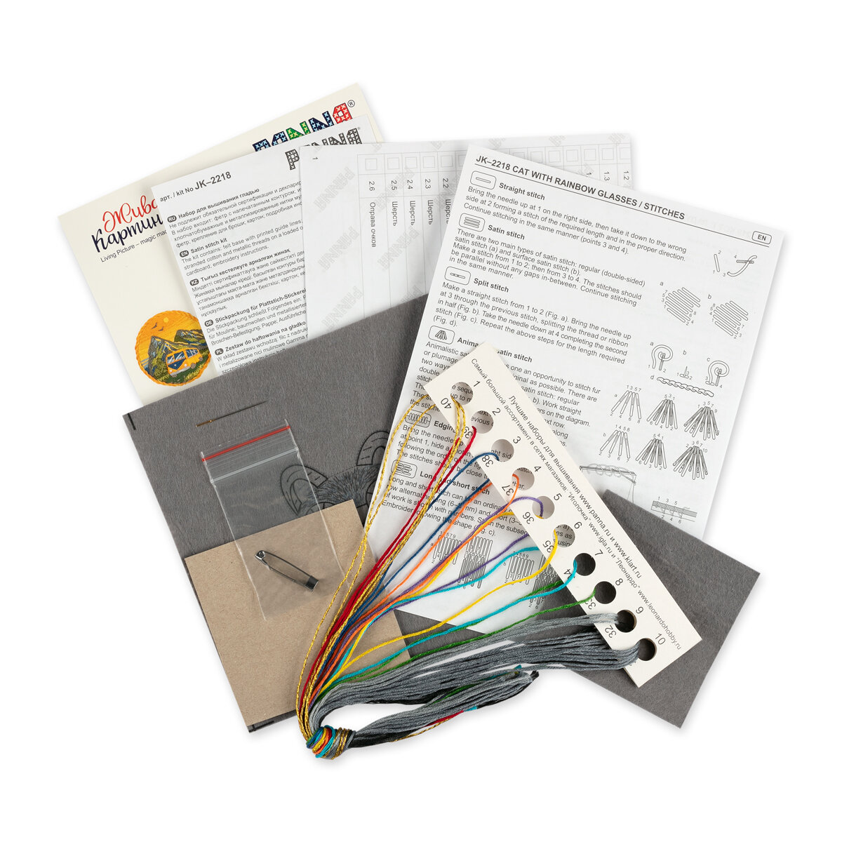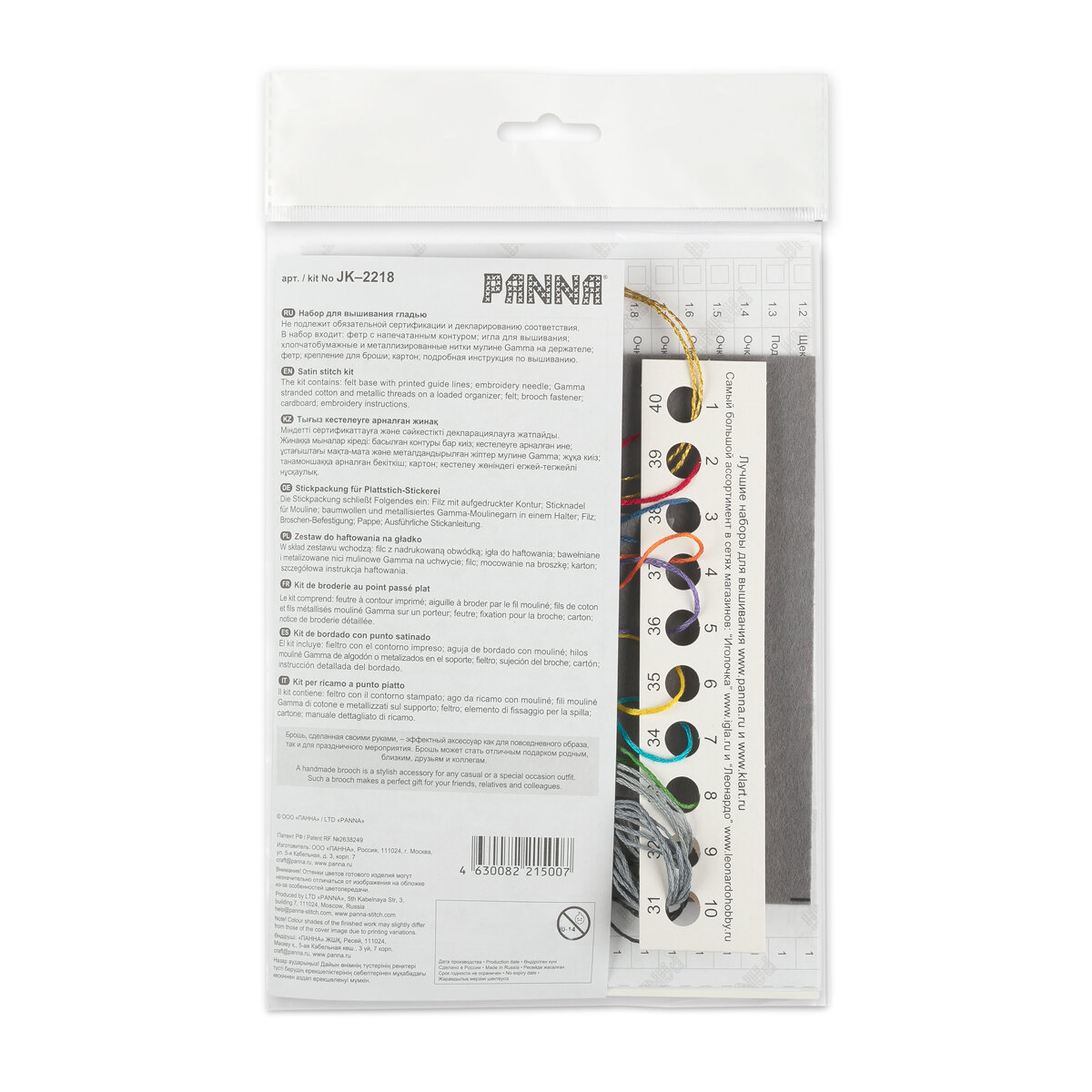 | Комплектация | Фетр с напечатанным контуром; Фетр для задней стороны броши; Хлопчатобумажные нитки мулине Gamma на держателе; Игла Gamma; Основа для броши из картона; Замочек для броши; Подробная пошаговая инструкция с цветными иллюстрациями |