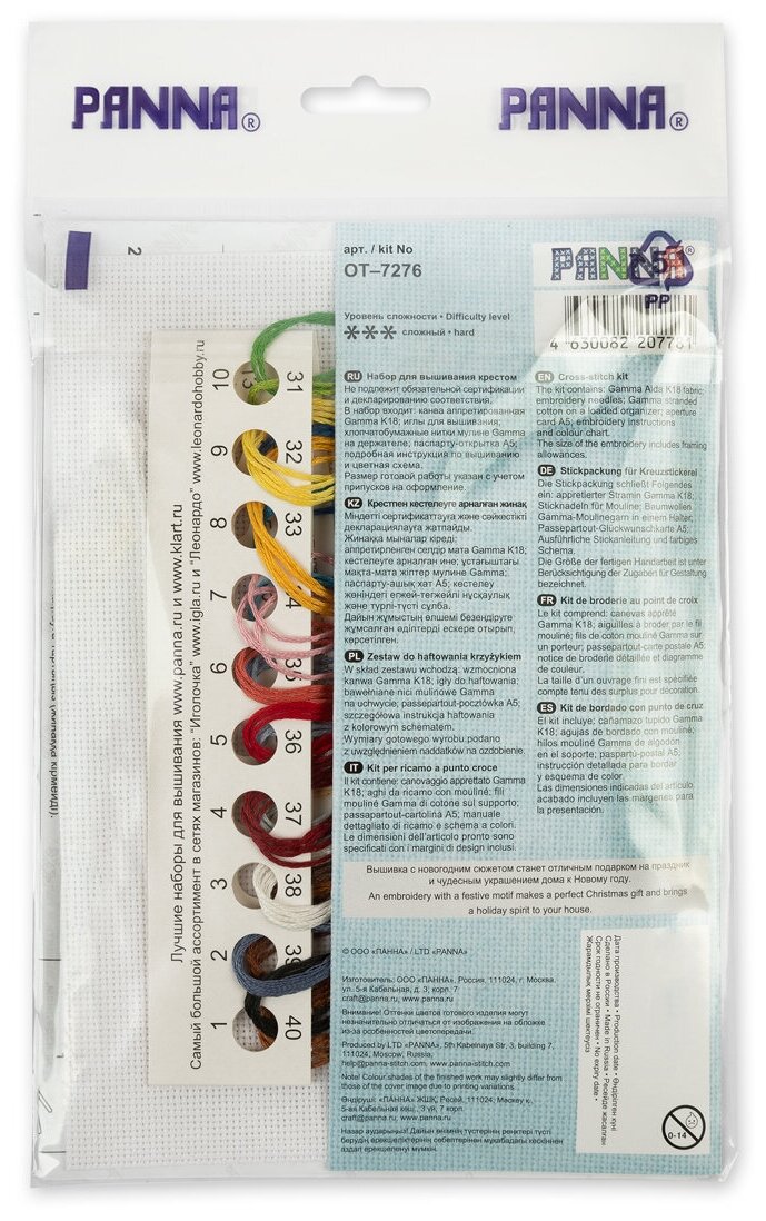 | Комплектация | канва; нитки мулине - 22 цвета; игла; паспарту; клеевой вкладыш; схема; инструкция по вышиванию и сборке открытки |