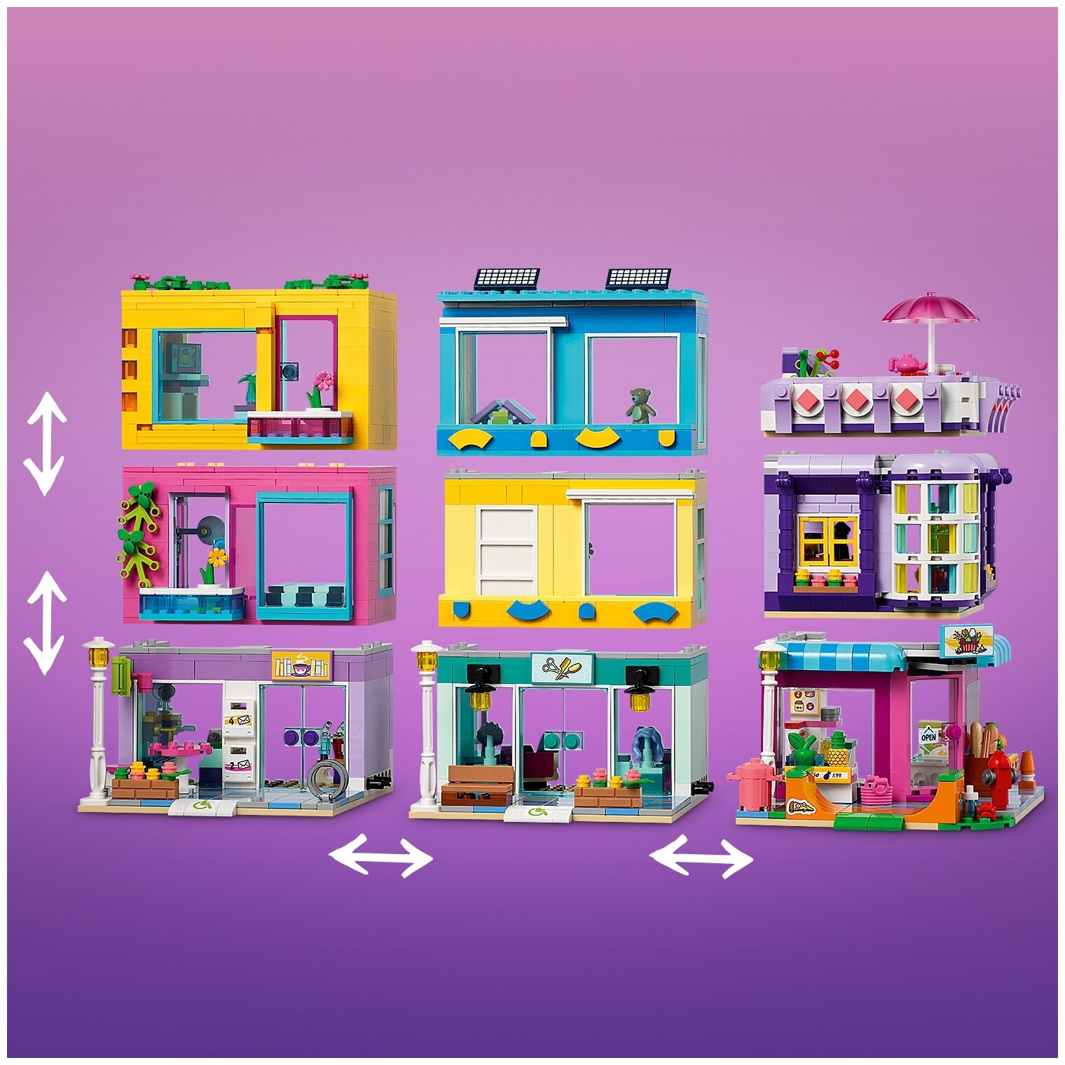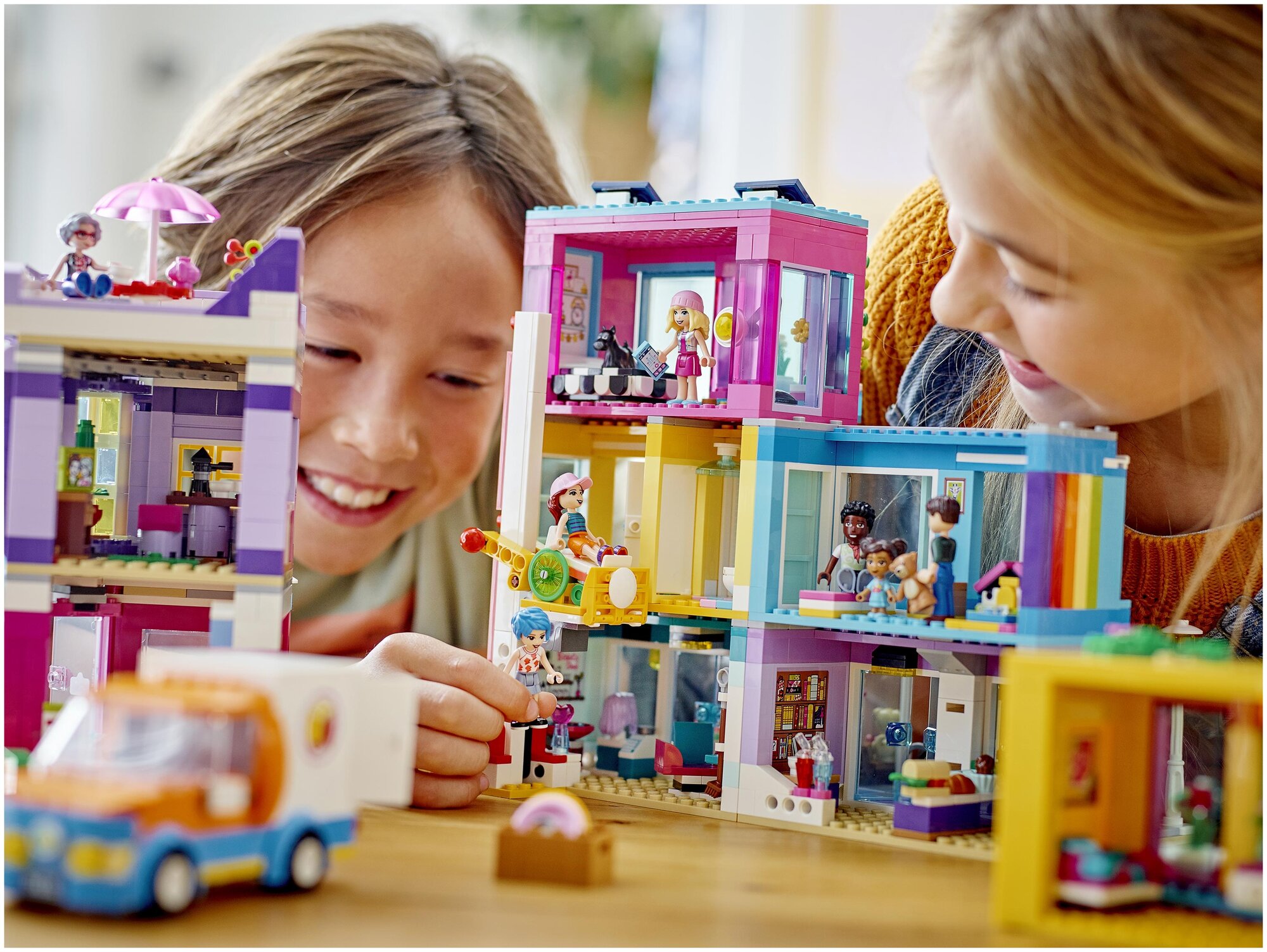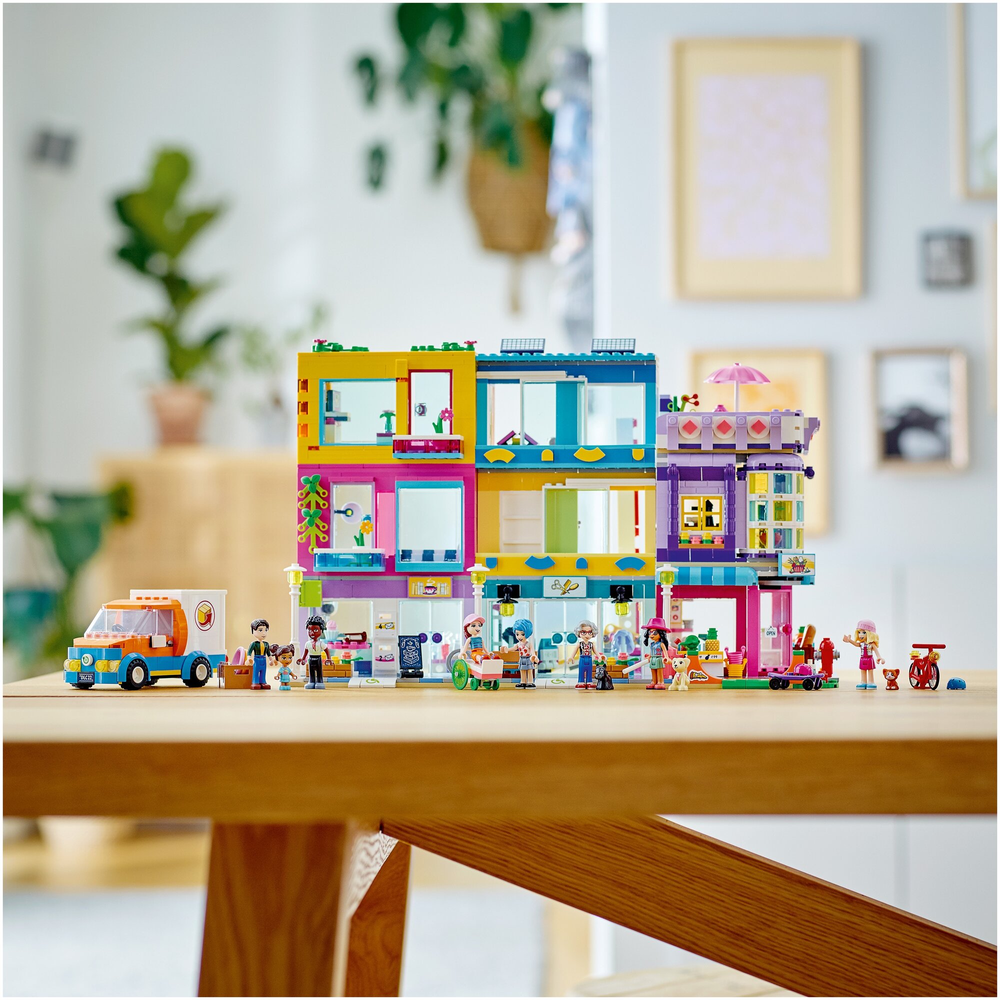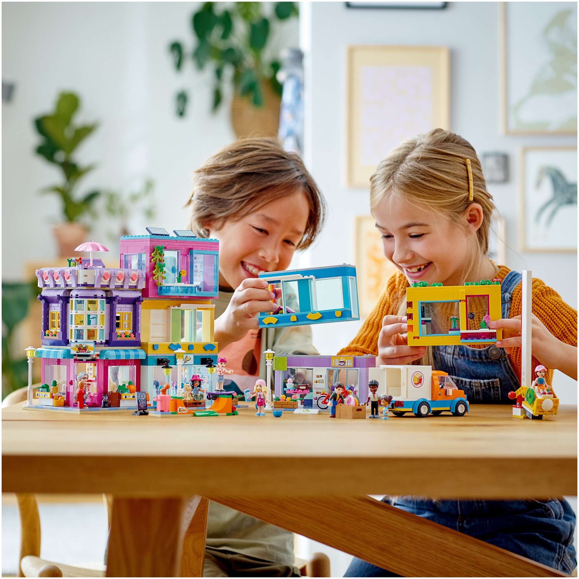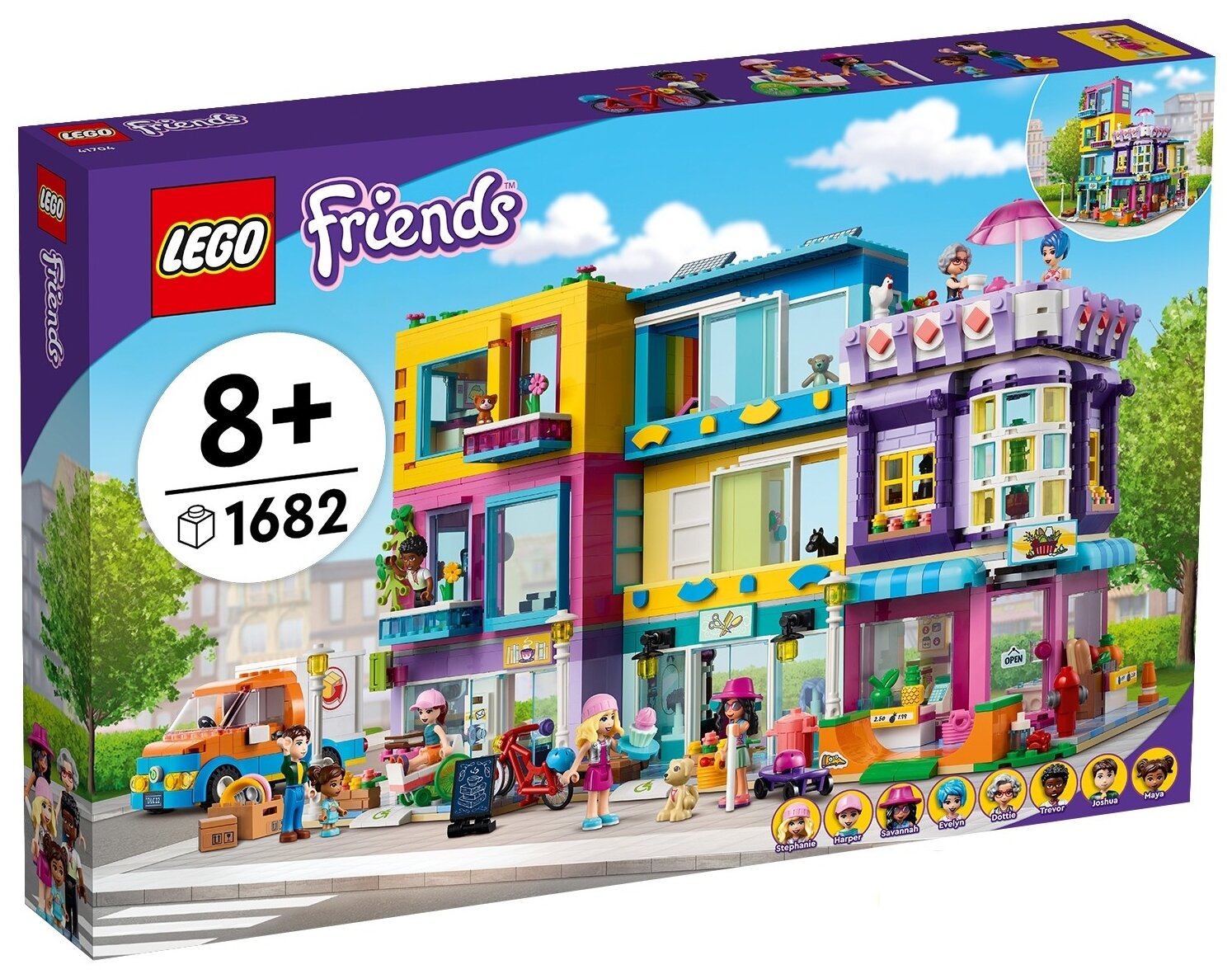 Поклонникам LEGO Friends в возрасте от 8 лет понравится проводить время в самом центре сообщества с набором «Большой дом на главной улице» (). В наборе три здания, которые соединяются в квартал для горожан. Здесь есть парикмахерская, рынок с продуктами со всего света и книжное кафе. Каждый элемент является модульным, так что творческим детям понравится расставлять здания, как им захочется! В набор входит 12 - да, целых 12! - фигурок, так что возможности для ролевой игры здесь поистине безграничны. Дети могут сделать прическу в салоне у Тревора, провести время в квартире Дотти, исполнять трюки на скейтборде со Стефани или придержать дверь для Харпер, которая катит на своей инвалидной коляске в кафе.