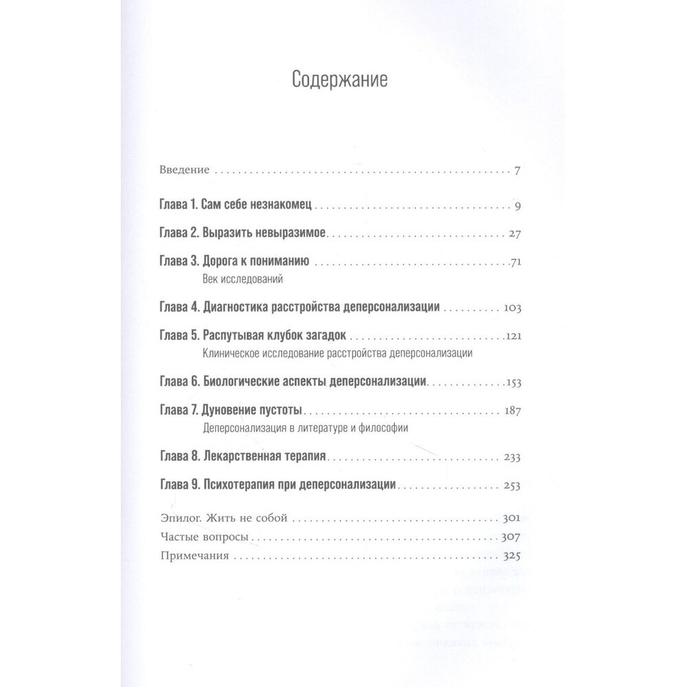 Некоторые люди чувствуют себя оторванными от своего «я», а мир вокруг кажется им нереальным, словно их жизнь происходит с кем-то другим. Это состояние называется деперсонализацией, оно малоизучено и трудно диагностируется. Известно, что его может вызвать пережитая травма или сильный стресс, но в России очень мало специалистов, которые работают с этим расстройством и умеют его лечить. В книге американского психиатра Дафни Симеон и австралийского журналиста Джеффри Абугела, много лет живущего с деперсонализацией, впервые опубликованной на русском языке, подробно описаны клинические признаки, история исследований, теории патогенеза и методы терапии деперсонализационного расстройства. Работа авторов основана на знаниях, накопленных Школой медицины Маунт-Синай и британским Институтом психиатрии при Кембриджском университете, и будет интересна специалистам в области психического здоровья и людям с деперсонализацией, которые пытаются понять, что с ними происходит, и найти путь к выздоровлению.