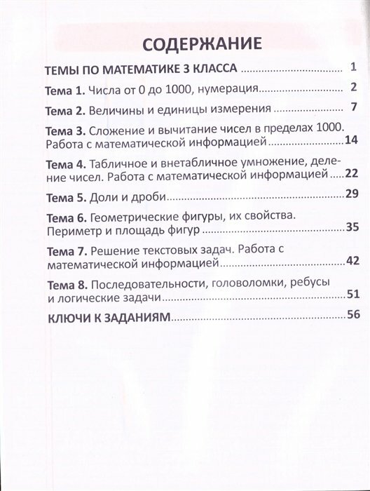 Материал в пособии равномерно распределён по основным разделам курса математики: "Числа", "Величины", "Арифметические действия", "Текстовые задачи", "Пространственные отношения и геометрические фигуры", "Математическая информация".