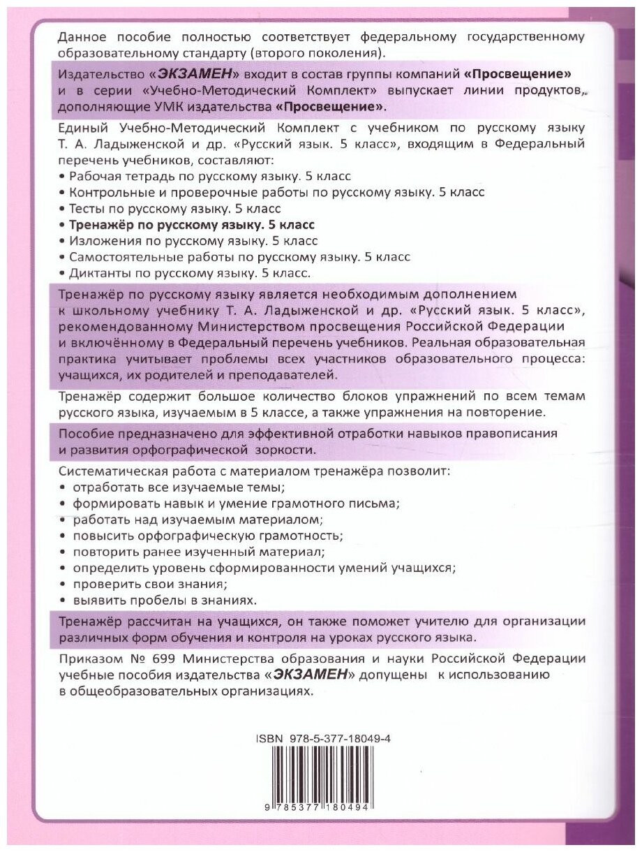 Тренажёр содержит большое количество упражнений по всем темам, изучаемым в 5-м классе. Систематическая работа с пособием позволит: