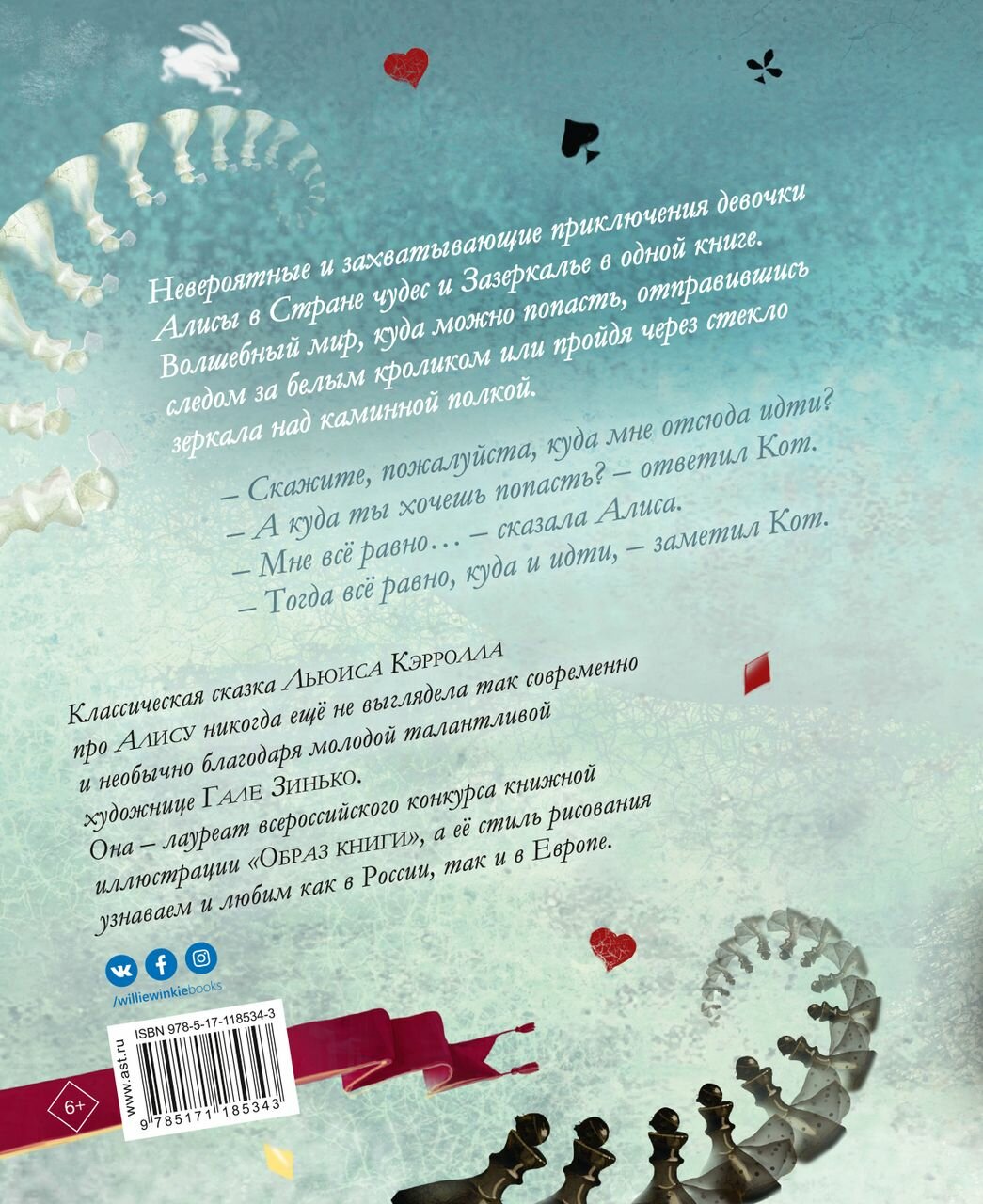 Невероятные и захватывающие приключения девочки Алисы в Стране чудес и Зазеркалье в одной книге. Волшебный мир, куда можно попасть, отправившись следом за Белым кроликом или пройдя через стекло зеркала над каминной полкой. Классическая сказка Льюиса Кэрролла никогда ещё не выглядела так современно и необычно благодаря талантливой художнице Гале Зинько, лауреату всероссийского конкурса книжной иллюстрации "Образ книги". Стиль рисования Гали Зинько узнаваем и любим как в России, так и в Европе.