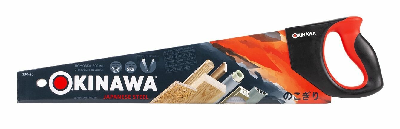 **Пила по дереву Okinawa 230-20** с длиной режущего полотна 500 мм используется для обработки деревянных заготовок. Модель позволяет вести поперечную и продольную распиловку по направлению от себя, так и к себе. Скошенный край не крошит детали, не формирует зазубрин в местах реза. Это повышает комфорт эксплуатации в труднодоступных участках.