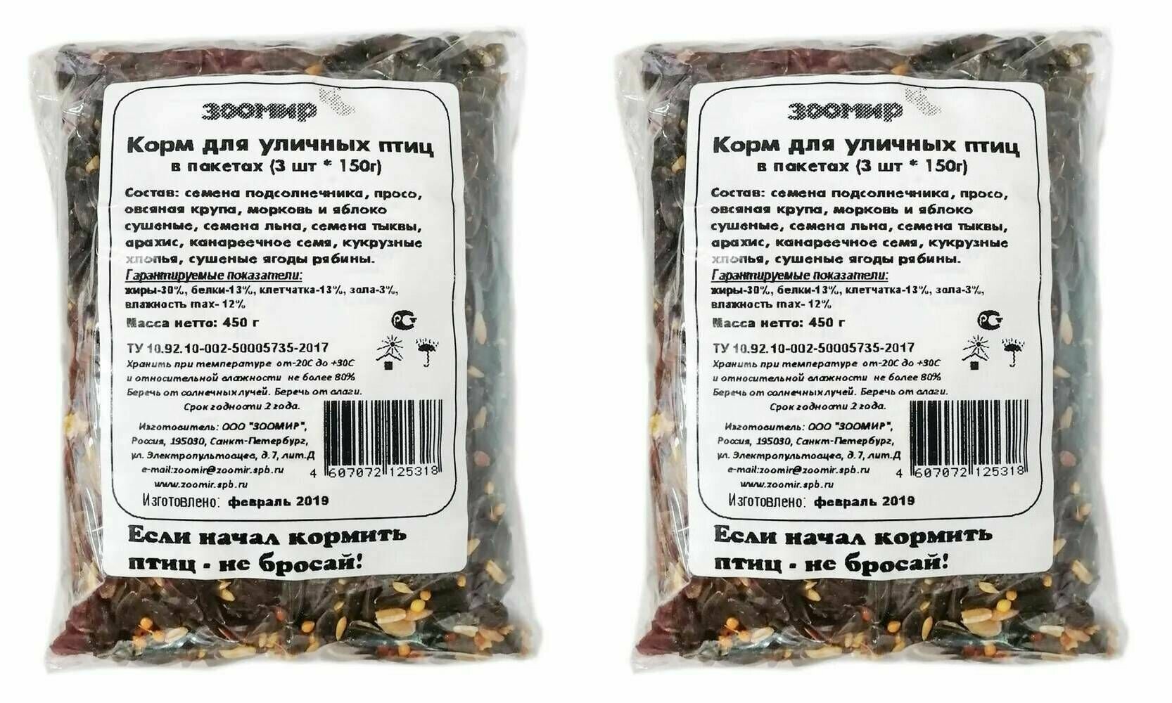"Корм для уличных птиц" зоомир - это готовая полезная смесь для регулярного кормления уличных, парковых и лесных птиц. Состоит из трех пакетов по 150 г корма, что удобно для трех пополнений или сразу для трех кормушек. Осень, зима и начало весны - испытание для пернатых. Они плохо переносят низкие температуры, снегопады, ветра, а тем более голод. Найти еду им очень сложно – все насекомые спрятались и только на некоторых деревьях остались съедобные плоды. Благо, многие неравнодушные люди делают все возможное, чтобы поддержать птиц в сезон холодов. Теперь кормить птиц стало еще удобнее - идя на прогулку просто захватите с собой компактный пакетик с кормом и высыпьте его в ранее повешенную вами кормушку зоомир или в любую другую! Обратите внимание на богатый состав нашего корма, он не просто питательный, за счет большого количества семечек, но также дополнен орехами, сушеными ягодами, овощами и фруктами. Всего 11 вкусных и полезных компонентов! Фасовка: 450 г (3 пакета по 150 г) В комплекте 2 уп.