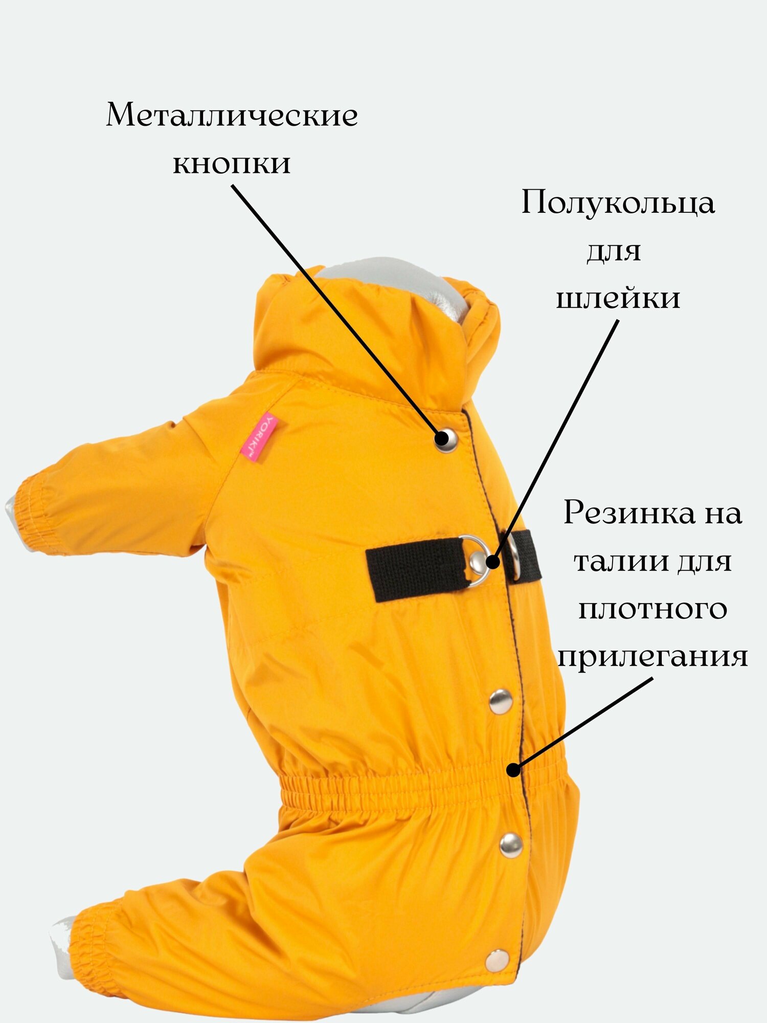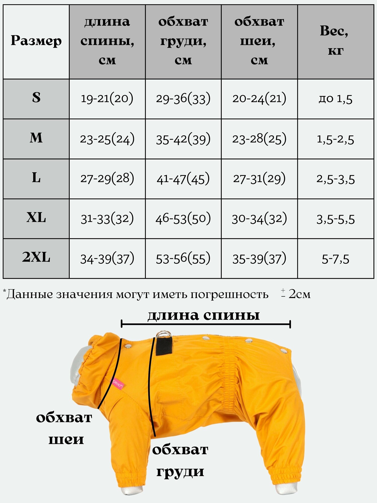 Демисезонный комбинезон с подкладом из флиса. Верх выполнен из водо-ветроотталкивающей плащевки, манжет курточный (резинка отстроченная по плащевке). Застежка на спине кнопки металлические, живот максимально закрыт. Пол: Девочка. Эластичная резинка на талии позволяет регулировать комбинезон по объему. На спине полукольца имитирующие шлейку Уход: стирка автомат деликатный режим, отпаривание. Длина по спине M - 24 см, L - 28 см, XL - 32 см (возможна погрешность 1 см в сторону увеличения). Соответствие размера согласно весу собаки: М - от 1,5 до 2,5 кг, L - от 2,5 до 3,7 кг, XL - от 3,5 до 5 кг.