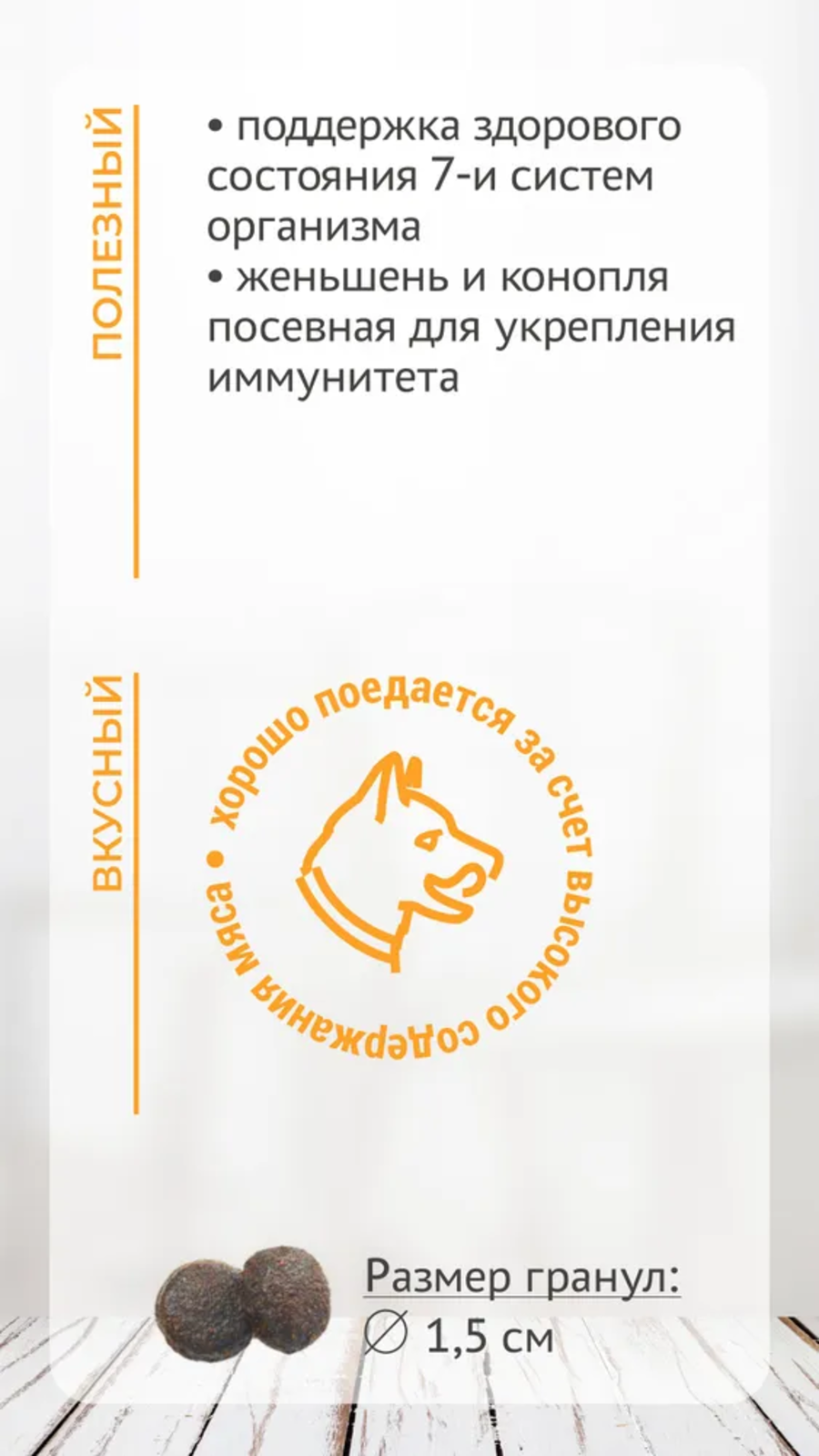 Полнорационный корм для взрослых собак средних и крупных пород с ягненком и олениной.Полезные свойства:поддержка здорового состояния 7-и систем организмаотсутствие зерна и глютена, искусственных ароматизаторов, красителей, консервантов.натуральный и питательныйразмер гранул 1,5 смхондропротекторы глюкозамин и хондроитин поддерживают здоровье суставовженьшень, таурин, антиоксиданты для здоровья сердечно-сосудистой системывитамин А, антиоксиданты, таурин для хорошего зрениядля красоты кожи и шерсти в корме незаменимые жирные кислоты класса Омега-3, витамины группы В, биотин.Содержат комплекс особых фитонутриентов, которые уменьшают последствия негативного влияния экологии крупных городов и направлены на общее укрепление, очищение и антиоксидантную защиту организма:женьшень укрепляет иммунитет, улучшает обмен веществ; конопля посевная способствует повышению иммунитета и общего тонуса организма, используется для профилактики аллергических заболеваний;псиллиум улучшает работу желудка и кишечника, облегчает усвоение питательных веществ, нормализует микрофлору кишечника, выводит токсины и шлаки из организма;розмарин, гвоздика и куркума — натуральные антиоксиданты, нейтрализуют разрушающее действие свободных радикалов, предотвращая преждевременное старение организма.