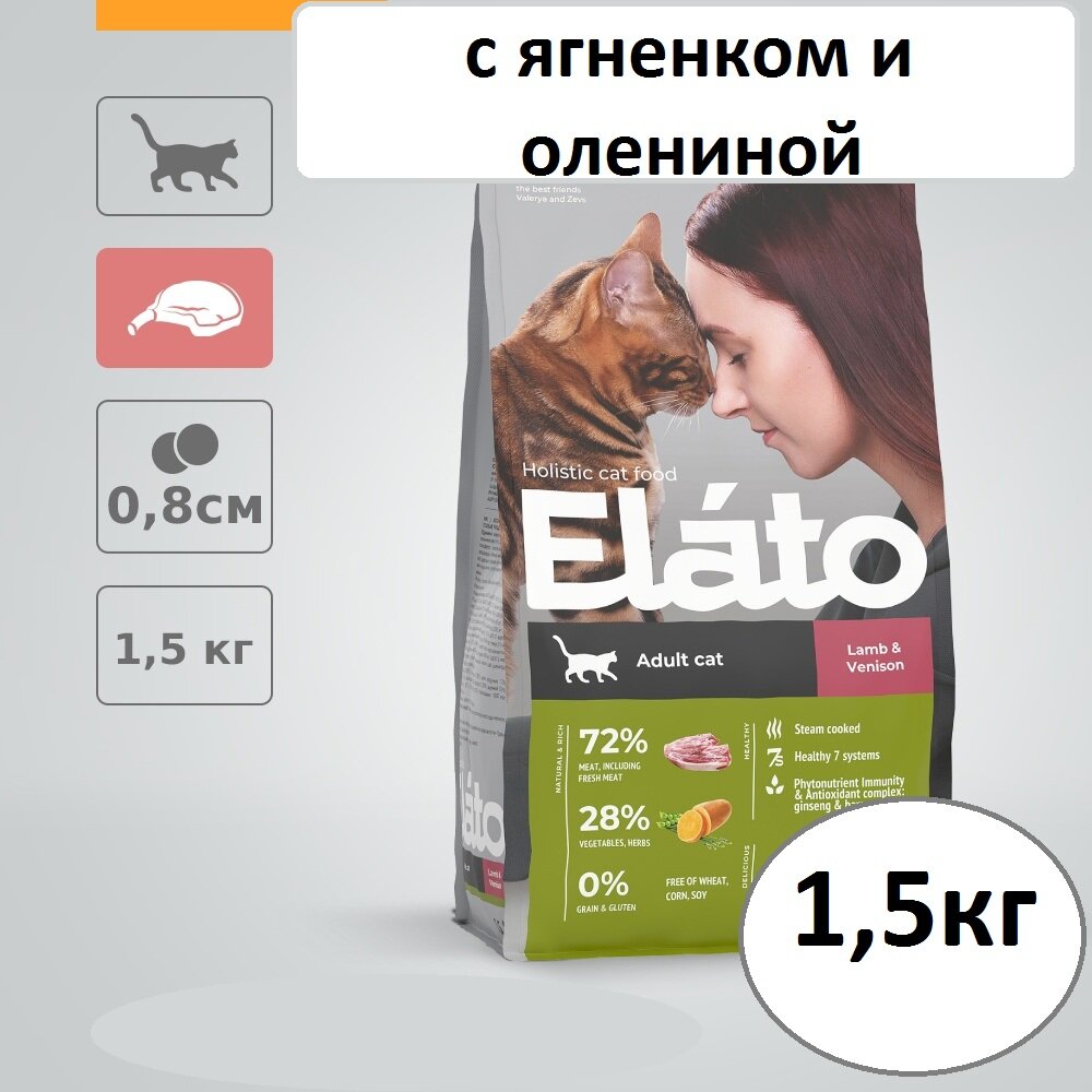 Elato - полнорационные сбалансированные натуральные корма класса холистик, соответствующие естественным потребностям и принципам здорового питания животных, изготовленные по современной технологии с обработкой паром.Корм Elato Holistic для взрослых кошек с ягненком и олениной поддерживает здоровое состояние 7-и важных систем организма и укрепляет иммунитет за счет женьшеня, конопли посевной и полного комплекса витаминов.