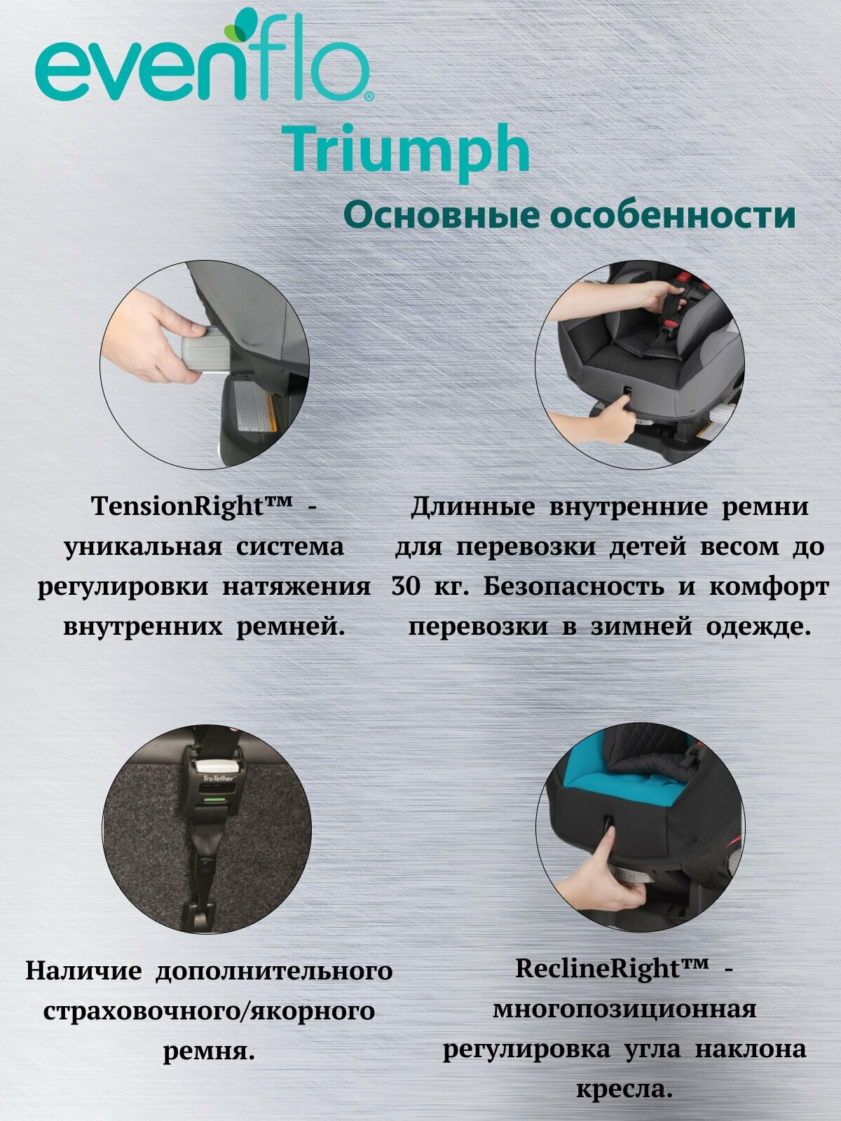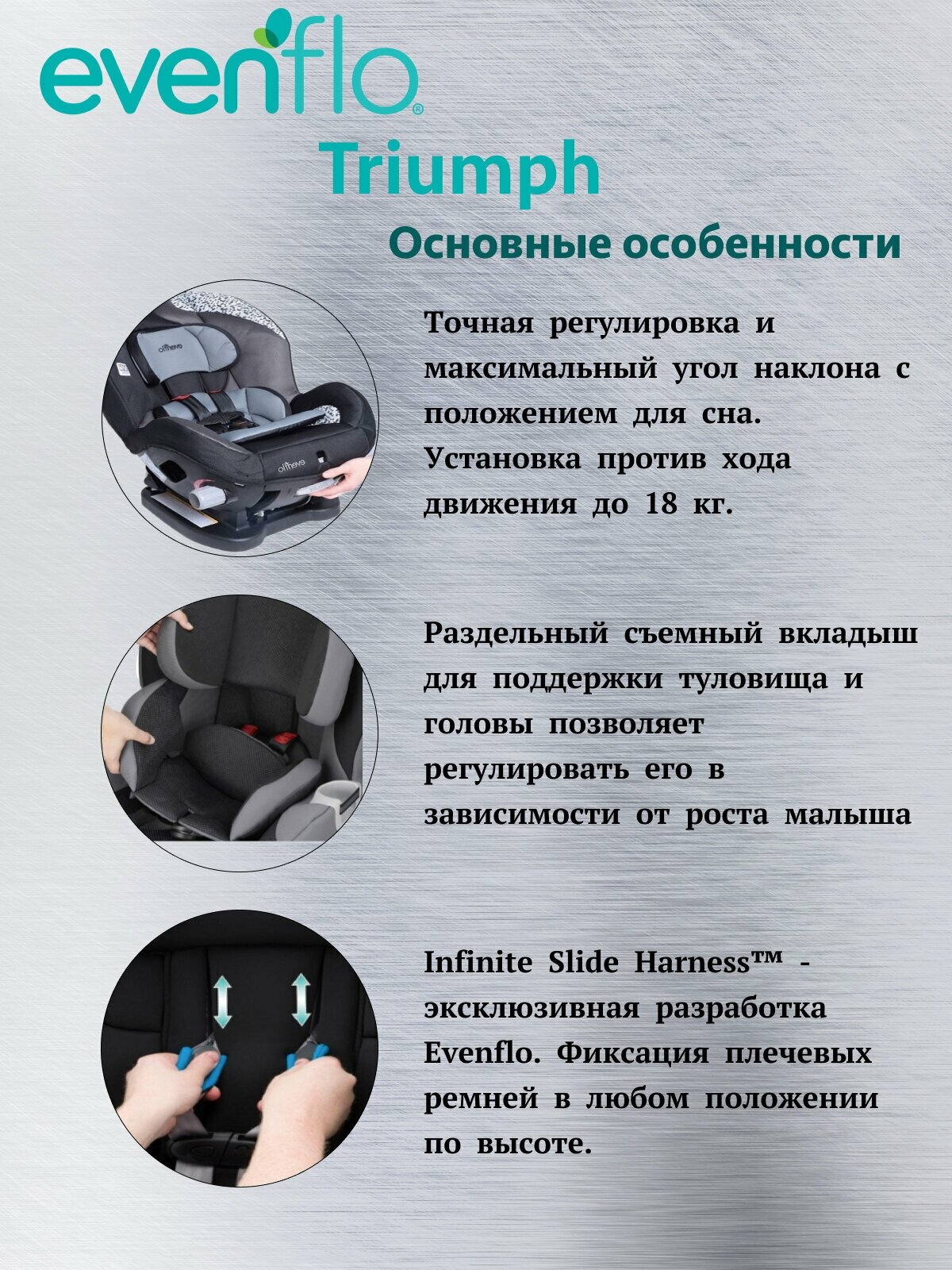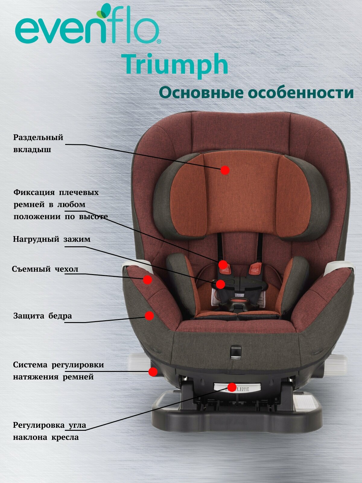 Группа I-II, от 2,2 до 29,5 кг (от 0 до 9 лет)Автокресло Evenflo Triumph успешно прошло все краш-тесты.Показатели качества и безопасности превысили стандарты. Сверхпрочная боковая защита.Evenflo Triumph - это ультрасовременные технологии с высокой степенью безопасности. Особенности автокресла Evenflo Triumph:Корпус автокресла выполнен из ударопрочного пластика.Дополнительная набивка из энергопоглощающего материала защищает ребенка.Специальная подушка для новорожденного.Широкое и удобное сиденье.Регулируемый наклон спинки сиденья для отдыха ребенка.Съемный подголовник.Уникальная система для фиксации ремня на любой высоте.Специальное устройство по бокам для правильного натяжения ремней.Подушечка для головы для детей постарше.Удобный откидной подстаканник.Съемный чехол, стирается при 30 градусах.Увеличенная боковая защита и инновационная технология безопасности.nfinite Slide Harness™ - эксклюзивная разработка Evenflo. Фиксация плечевых ремней в любом положении по высоте.Точная регулировка