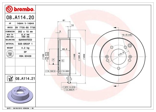 Тормозной диск 08. A114.20 BREMBO. Цена указана за 1 единицу товара! (Даже в том случае, если тормозные диски продаются по 2 штуки в 1-ой упаковке). При обслуживании (замене) тормозные дисков рекомендуется осуществлять замену обоих (двух) дисков, расположенных на одной оси, одновременно. Обратите внимание: Минимальное-допустимое количество к заказу данного товара - 2 штуки.