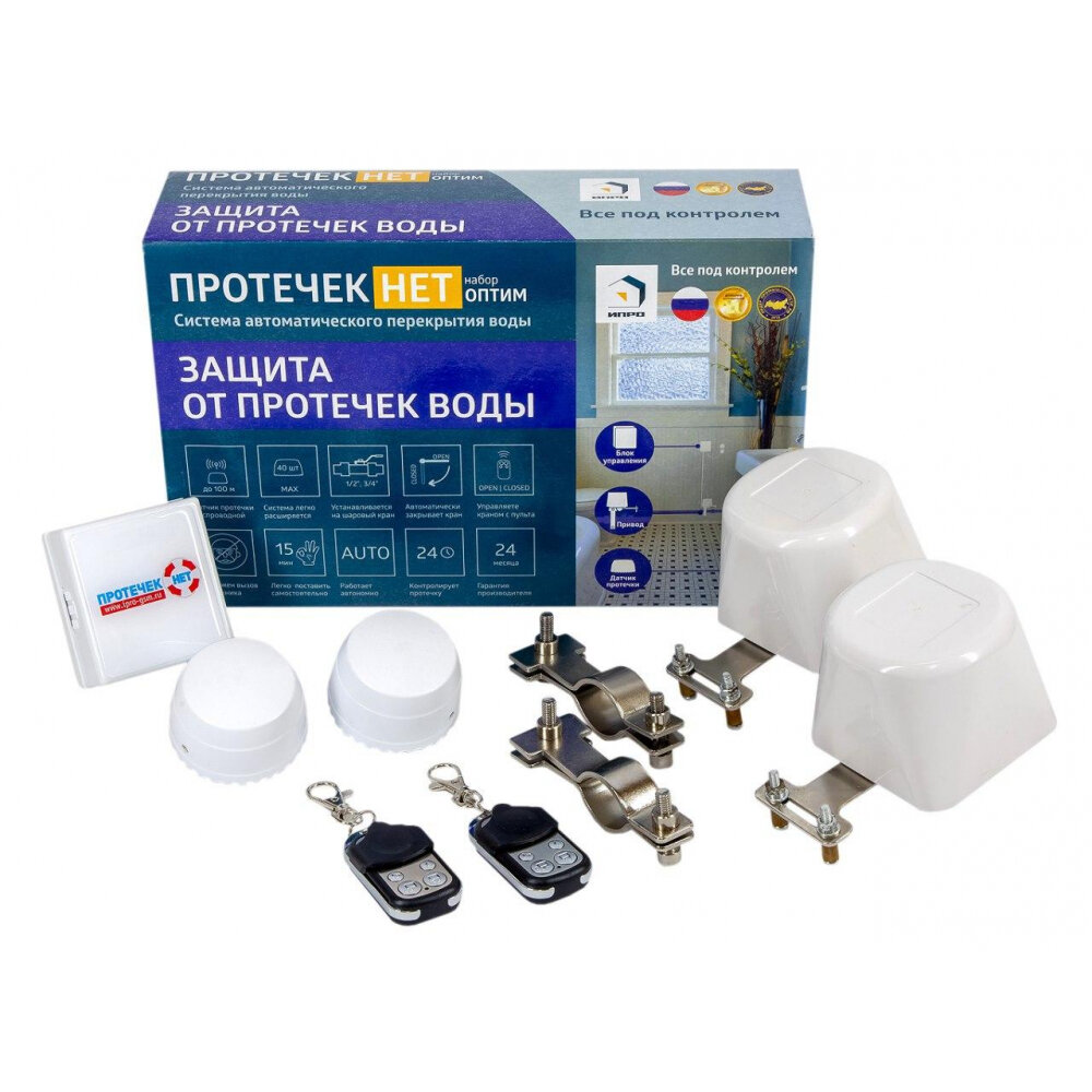 Система защиты от протечек воды " протечек НЕТ" набор Оптим – автоматический комплекс для защиты от протечек и перекрытия подачи воды. Время от обнаружения до полного перекрытия - менее 10 секунд.Набор полностью запрограммирован и готов к использованию. Необходимо только разместить беспроводные датчики и установить электропривод на кран.
