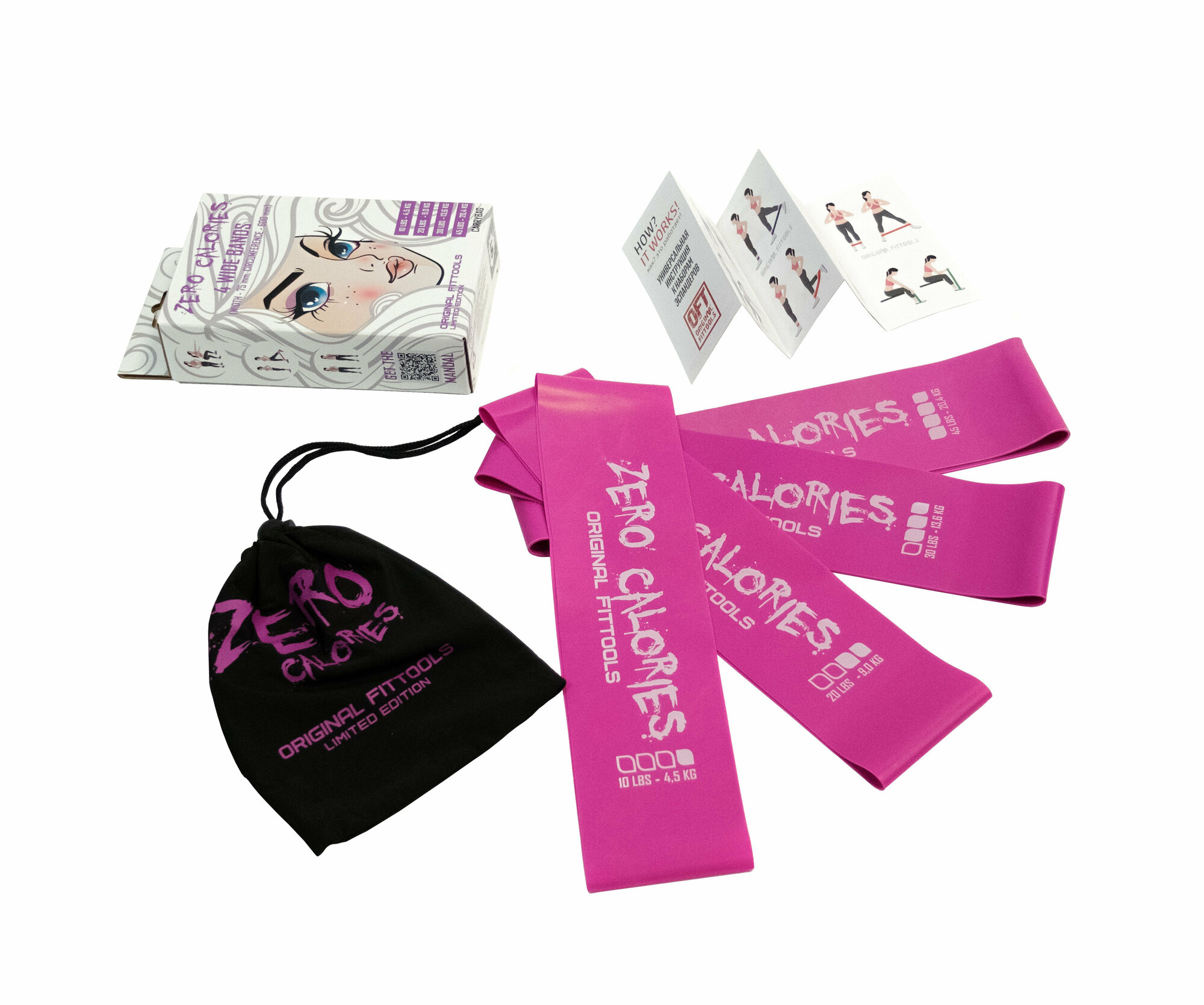 Набор состоит из 4 удобных эспандеров шириной 75 мм и длиной по окружности 600 мм, с нагрузкой 4,5кг/9кг/13,6кг/20,4кг соответственно.К набору фитнес резинок входит в комплект удобная сумочка для хранения и красочная инструкция с упражнениями на многие группы мышц.