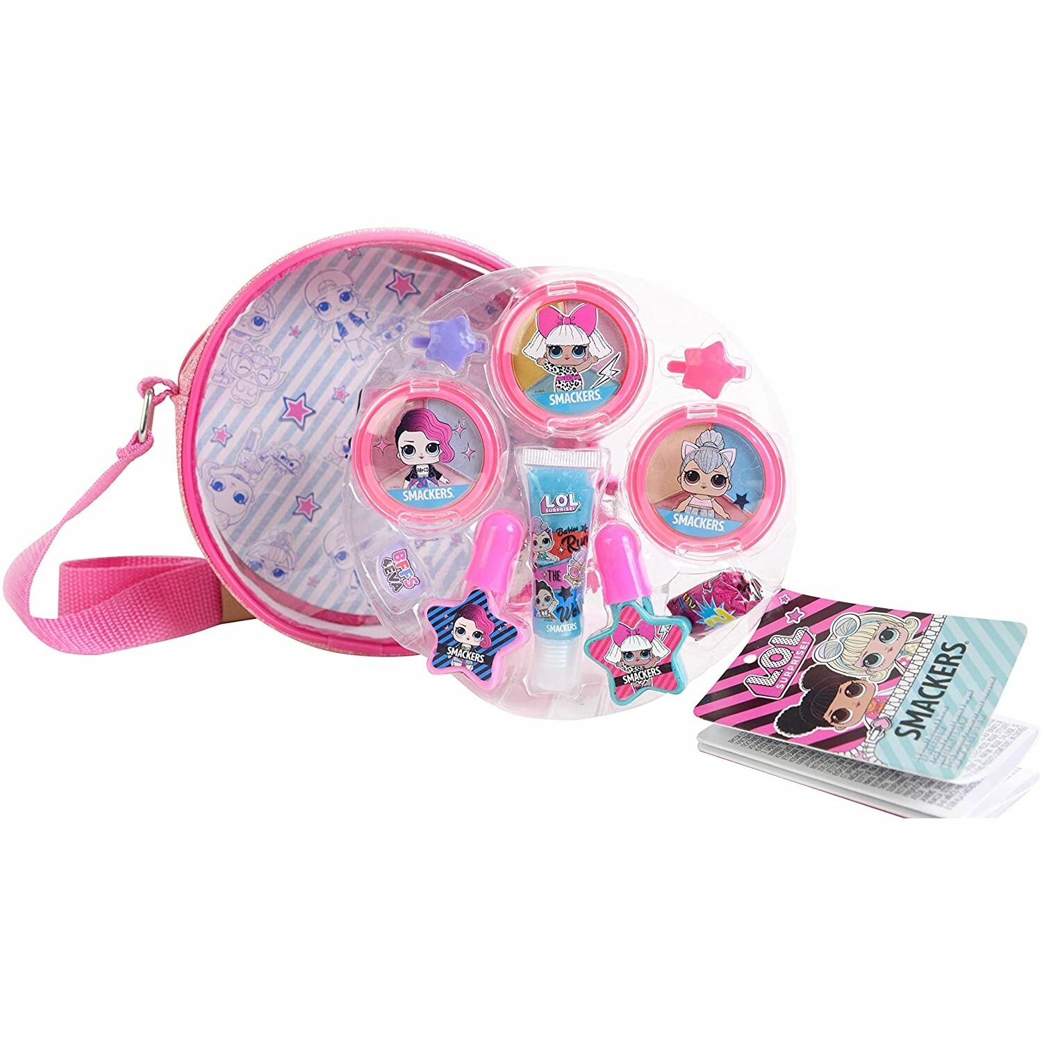 Набор детской декоративной косметики для лица и ногтей в круглой розовой сумочке с застежкой молнией и ремешком в стиле LOL Surprise.