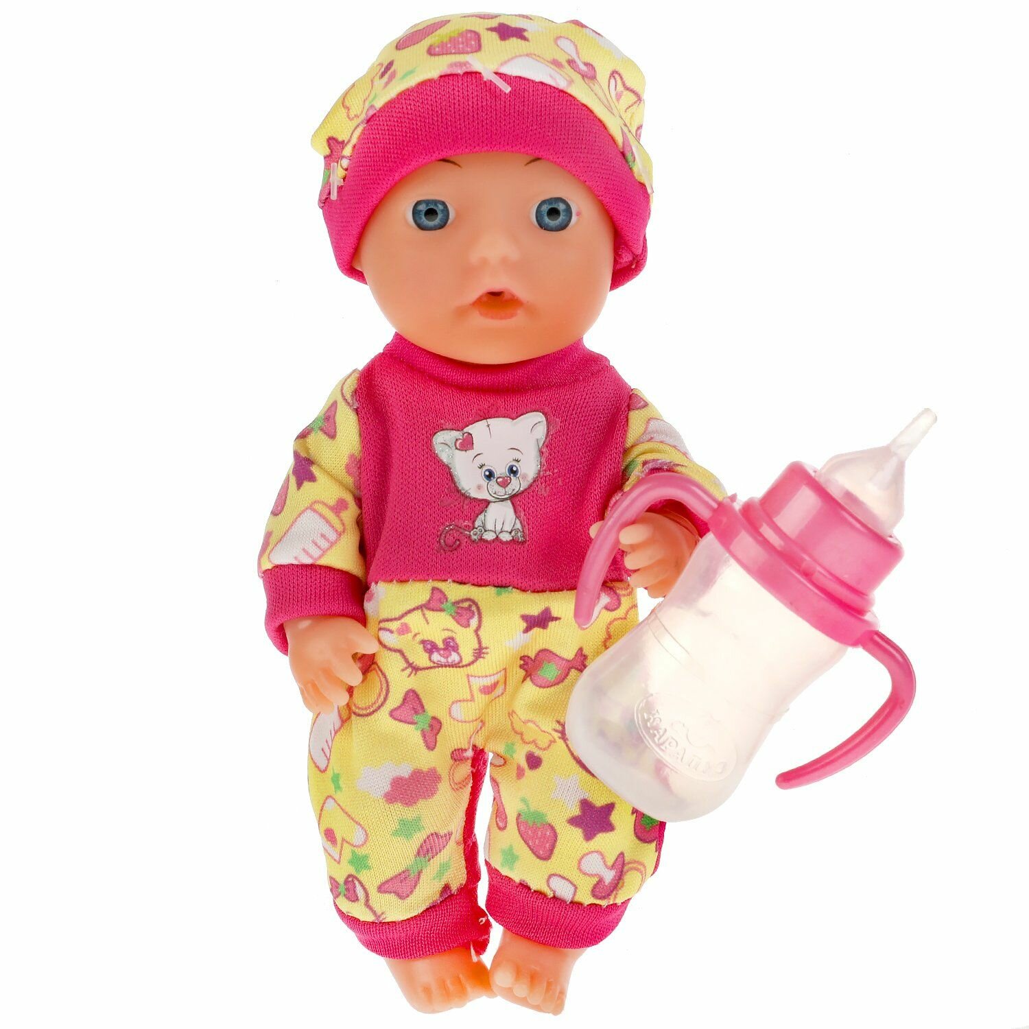 Милый пупс Машенька, с детально проработанным личиком, обязательно понравится вашей малышке. Кукла одета в яркий комбинезончик с принтом, украшенный изображением котёнка. На голове у пупса - шапочка в тон. Одежда легко надевается и снимается.