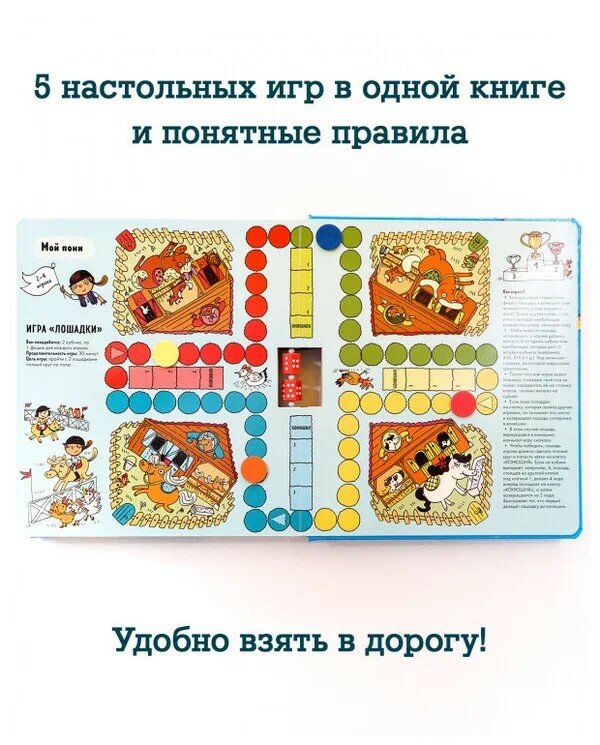 Моя большая книга игр - это целая сокровищница увлекательных игр. Такого формата вы еще не видели: фишки, кубики, 5 настольных игр и понятные правила - всё в одной книге. Обложка и страницы из прочного плотного картона с ламинированной глянцевой поверхностью. Такая книга не помнется, ее удобно взять с собой в гости и в дорогу. В играх могут участвовать от 2 до 6 игроков, одна игра длится от 15 до 30 минут.