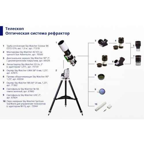 Sky-Watcher Evostar BK ED72 OTA – короткофокусный телескоп-дуплет с низкодисперсионной оптикой. Он покажет вам кольца Сатурна, Большое Красное Пятно на Юпитере, многообразие кратеров на Луне и красоты дальнего космоса. Этот апохроматический рефрактор может похвастаться широким полем зрения и высокой разрешающей способностью. Добавьте сюда невероятную компактность, и получите прекрасный оптический прибор для загородных наблюдений.