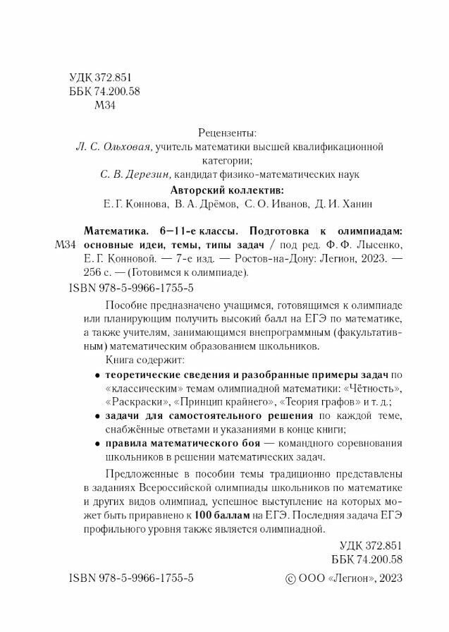 Математика. 6-11 классы. Подготовка к олимпиадам. Основные идеи темы типы задач (Коннова Елена Генриевна, Иванов Сергей Олегович, Дремов Виктор Александрович); Легион, 2022