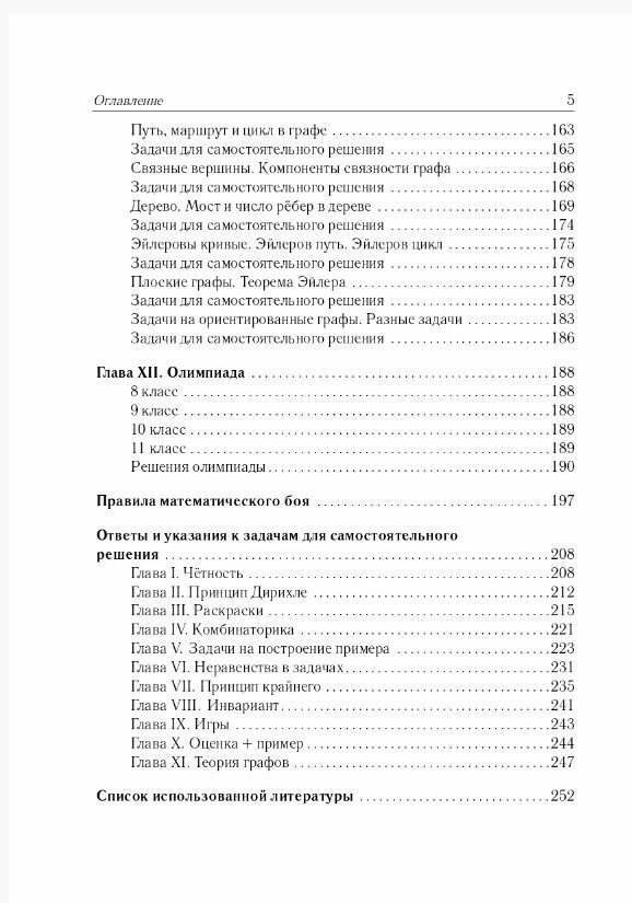 - теоретические сведения и разобранные примеры задач по "классическим" темам олимпиадной математики: "Чётность", "Раскраски", "Принцип крайнего", "Графы" и т. д.;
