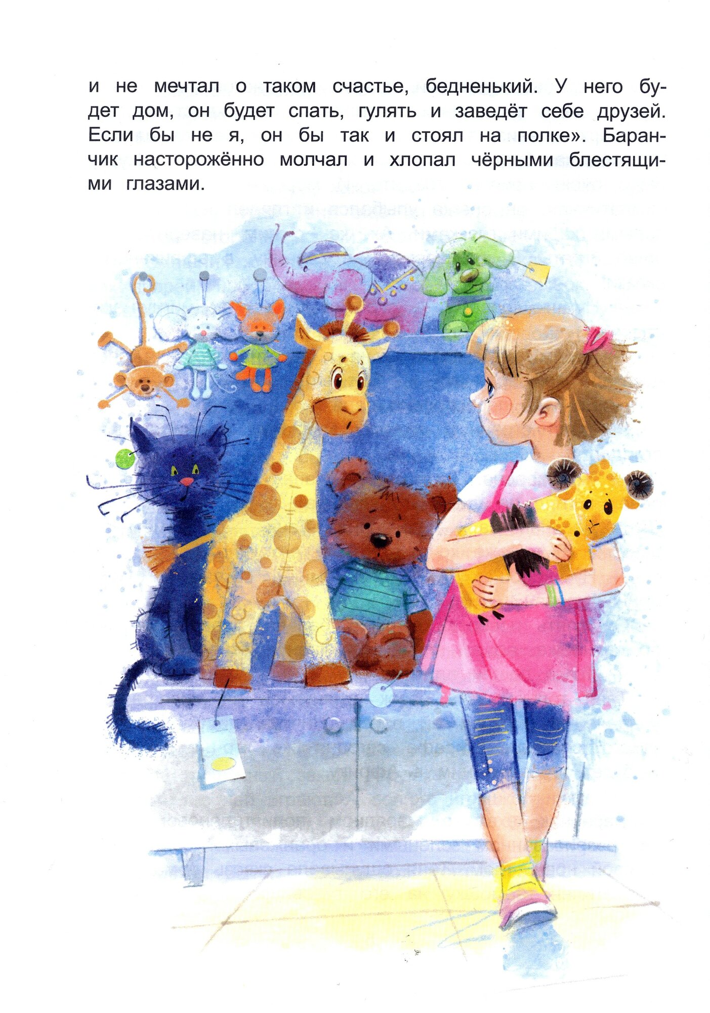 Как здорово прийти в игрушечный магазин за новой игрушкой! Новым другом, новым членом семьи. Выбор ужасно сложный, каждая игрушка надеется, что возьмут именно её… Таня пришла с папой в магазин и выбрала странного жёлтого пластмассового баранчика с непонятной гармошкой посреди туловища, как у автобуса. Девочке стало очень жаль эту нелепую игрушку, её наверняка больше никто не купит. Только добрая Таня. И баранчик поселился в детской. У Тани много игрушек, ему было с кем подружиться. Баранчик стал осматриваться, привыкать и приспосабливаться.