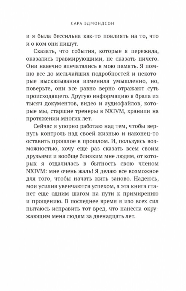 История из первых уст от женщины, которая долгое время состояла в тайном культе NXIVM. Под видом компании по организации тренингов личного роста, ее основатель Кит Раньер и его помощница Эллисон Мак, звезда сериала "Тайны Смолвиля", сформировали вокруг себя тоталитарную секту, которая занималась торговлей людьми и держала последовательниц в секс-рабстве с нанесением на тело раскаленным железом метки с инициалами Раньера. Сара Эдмондсон попала в секту, несмотря на хорошую жизнь и скептическое отношение к организации, но система была выстроена таким образом, что стоит в нее попасть, как выйти становится практически невозможно. И все же Сара нашла в себе силы вырваться и дать показания, которые легли в основу множества расследования и судебных дел. Эта книга изнутри покажет вам опасности культа глазами его участницы и даст понимание, как выбраться, когда весь твой мир строится вокруг него.