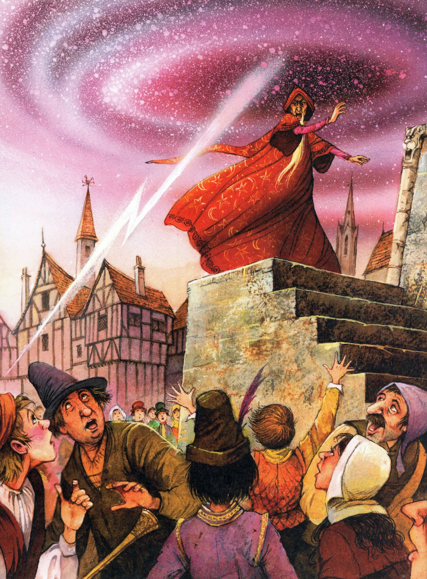 В дальнем конце одного переулка стояли два дома: в одном жила ведьма, а в другом – волшебник. И как-то во время обычной беседы они затеяли спор, кто из них больше смыслит в колдовстве. Тут началось настоящее соревнование, переросшее в войну! Каждый стремился поразить другого всё новыми и новыми заклинаниями. Что они только ни творили! Сад превращался в джунгли, усы и борода зеленели, метла горела, и это лишь некоторые из «чудес». Но в конце концов магия ведьмы и волшебника объединилась, и на земле появилось ужасное чудовище. Тут-то герои поняли, что их спасет только примирение.