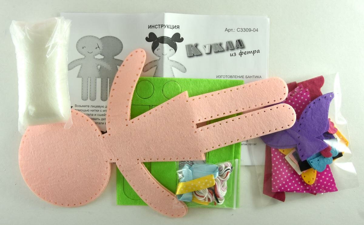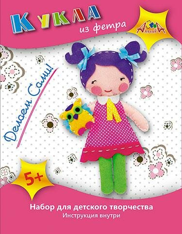 Набор для детского творчества "Шьем куклу из фетра" состоит из фетровых деталей куклы 270 х 180 мм., декоративных глазок, наполнителя, пластиковой иголки, шерстяной нити, самоклеящихся элементов, а также инструкции по изготовлению игрушки.