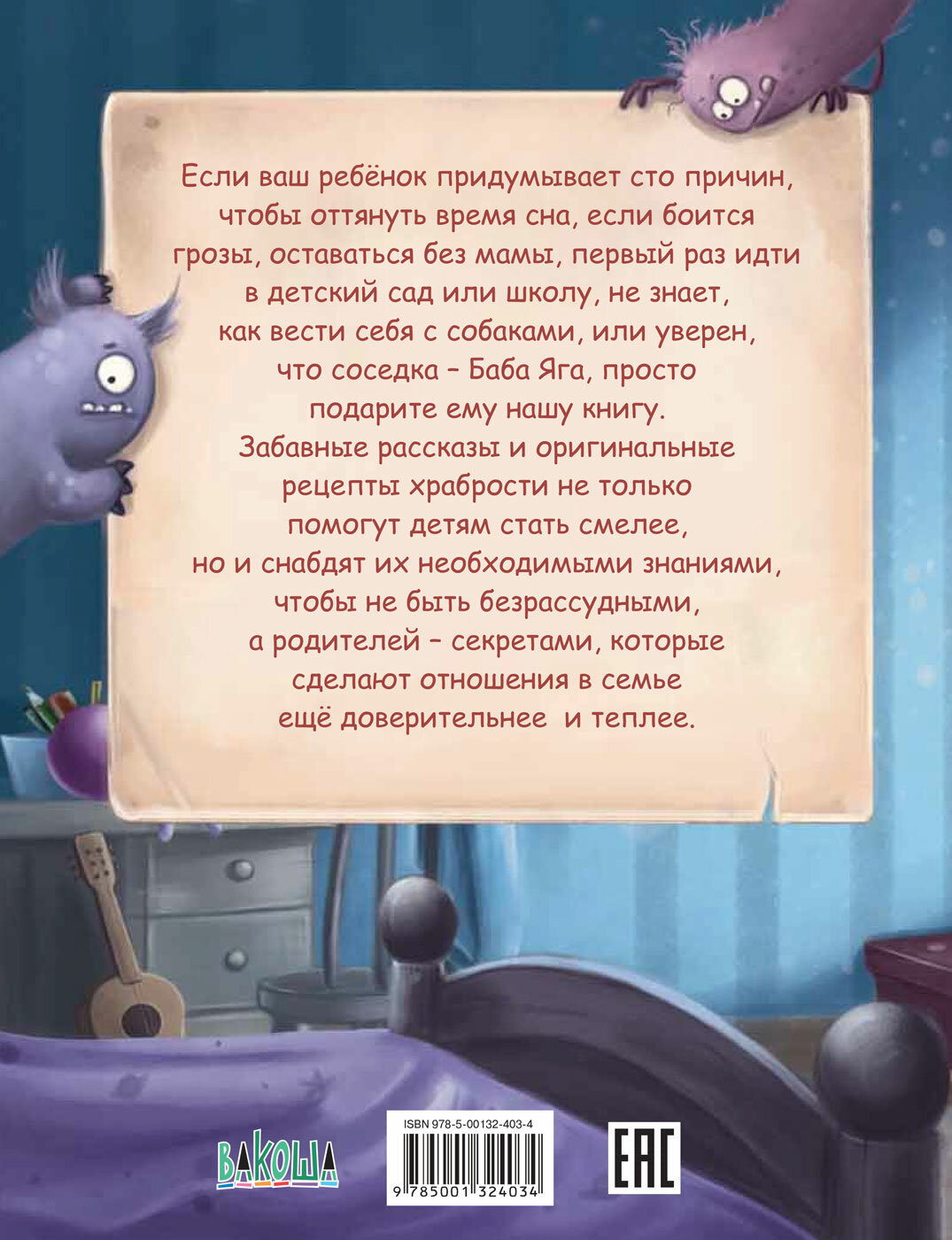 Если ваш ребёнок придумывает сто причин, чтобы оттянуть время сна, если боится грозы, оставаться без мамы, первый раз идти в детский сад или школу, не знает, как вести себя с собаками, или уверен, что соседка - баба Яга, просто подарите ему нашу книгу. Забавные рассказы и оригинальные рецепты храбрости, не только помогут детям стать смелее, но и снабдят их необходимыми знаниями, чтобы не быть безрассудными, а родителей - секретами, которые сделают отношения в семье ещё доверительнее и теплее.