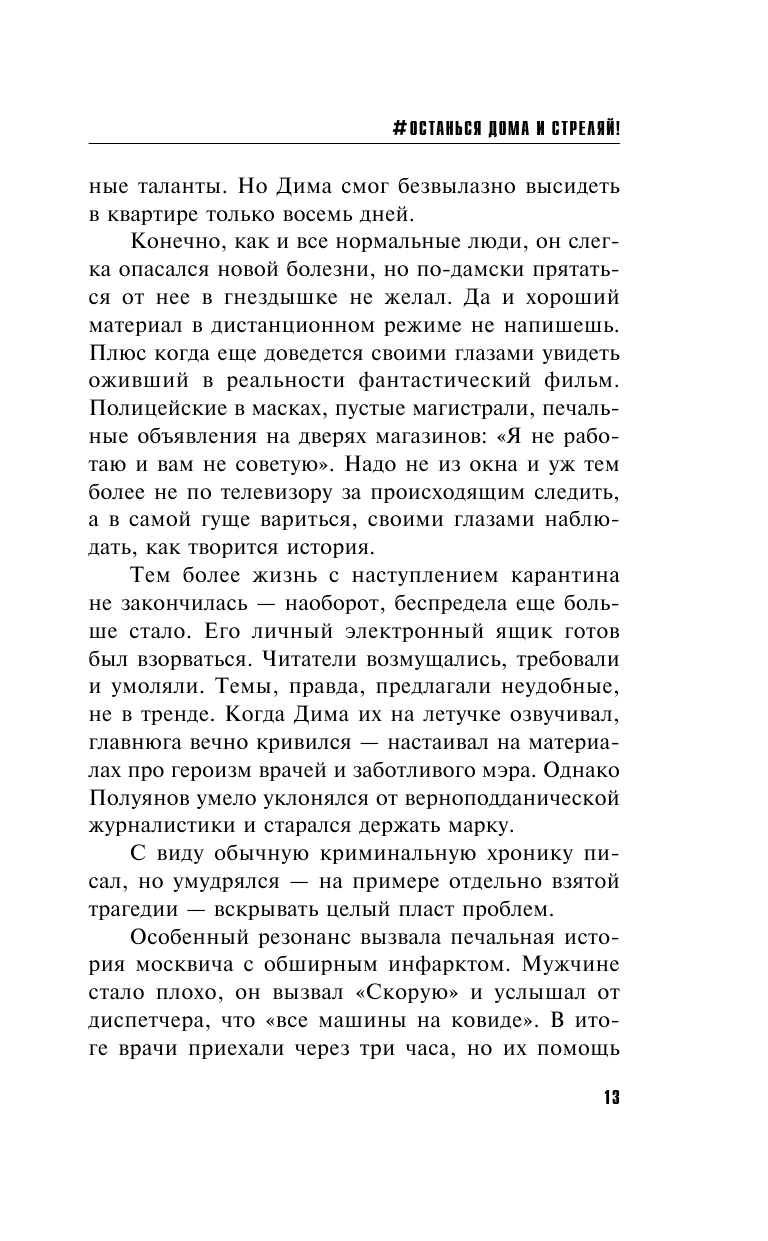 Новый роман Анны и Сергея Литвиновых, известных соавторов в мире российской остросюжетной литературы, носит интригующее название «#останься дома и стреляй!» Он безусловно займет достойное место среди их произведений. Закрученная интрига, понятные и близкие читателю персонажи, современные проблемы – вот секрет успеха хорошего детектива за авторством Литвиновых. Следствие вновь ведут хорошие известные читателям по романам и телесериалам герои — журналист Дима Полуянов и его верная подруга, библиотекарь Надя Митрофанова.