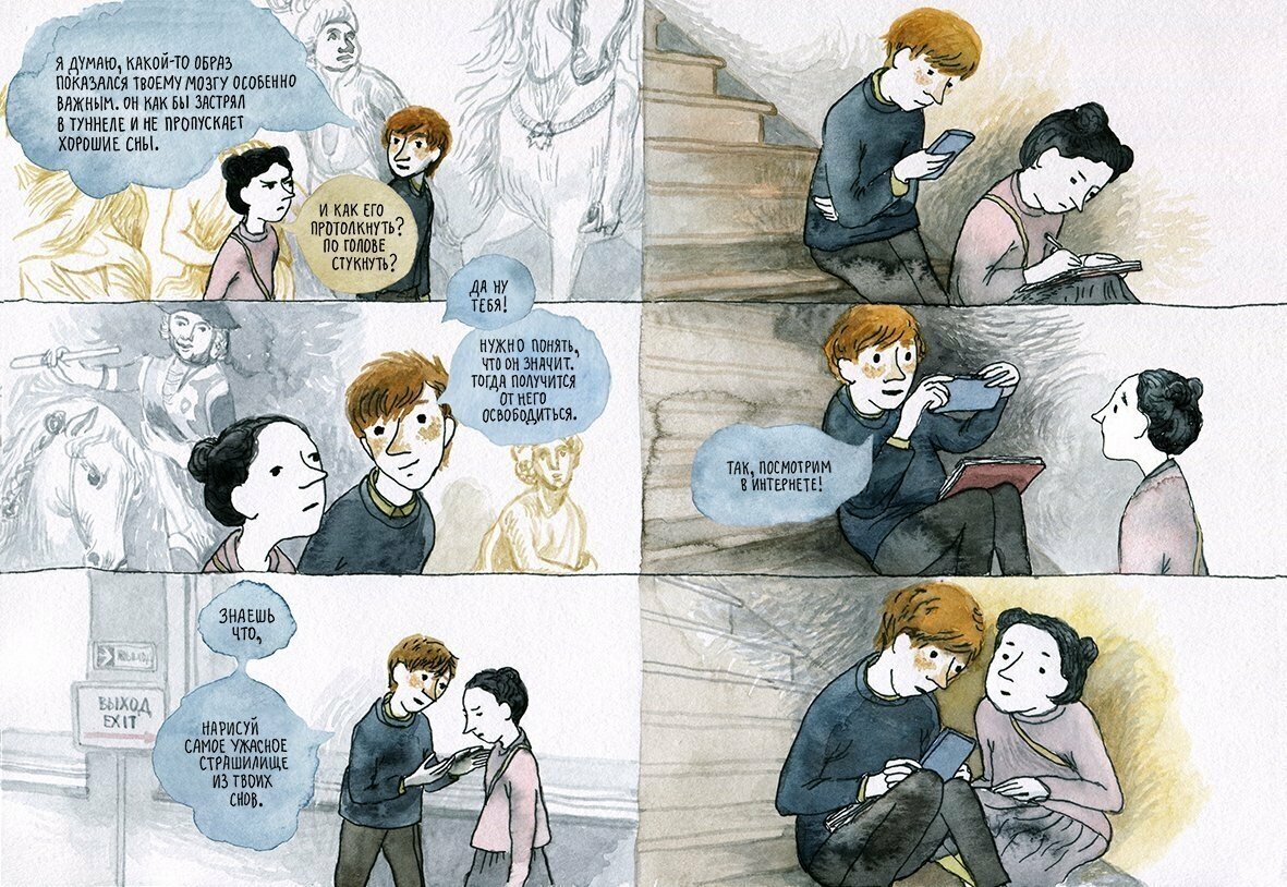 Даже не знаю, как определить жанр этих книг - и не комикс, и не графический роман. Они очень многослойны: их можно читать, просматривать, изучать справочный материал, помещенный в конце, вместе с Ваней и Тасей бродить по залам Эрмитажа (можно реально, захватив с собой книгу и пытаясь отыскать экспонаты из книги). Я, к сожалению, редко бываю в Питере и, будучи в Эрмитаже, брожу там всего пару часов, наметив конкретные залы, иначе "крышу сносит" от впечатлений, но в последний раз, набредя на Павильонный зал, который раньше проскакивала, остановилась и разглядывала мозаику, вспомнив путешествие Таси из первой книги.
