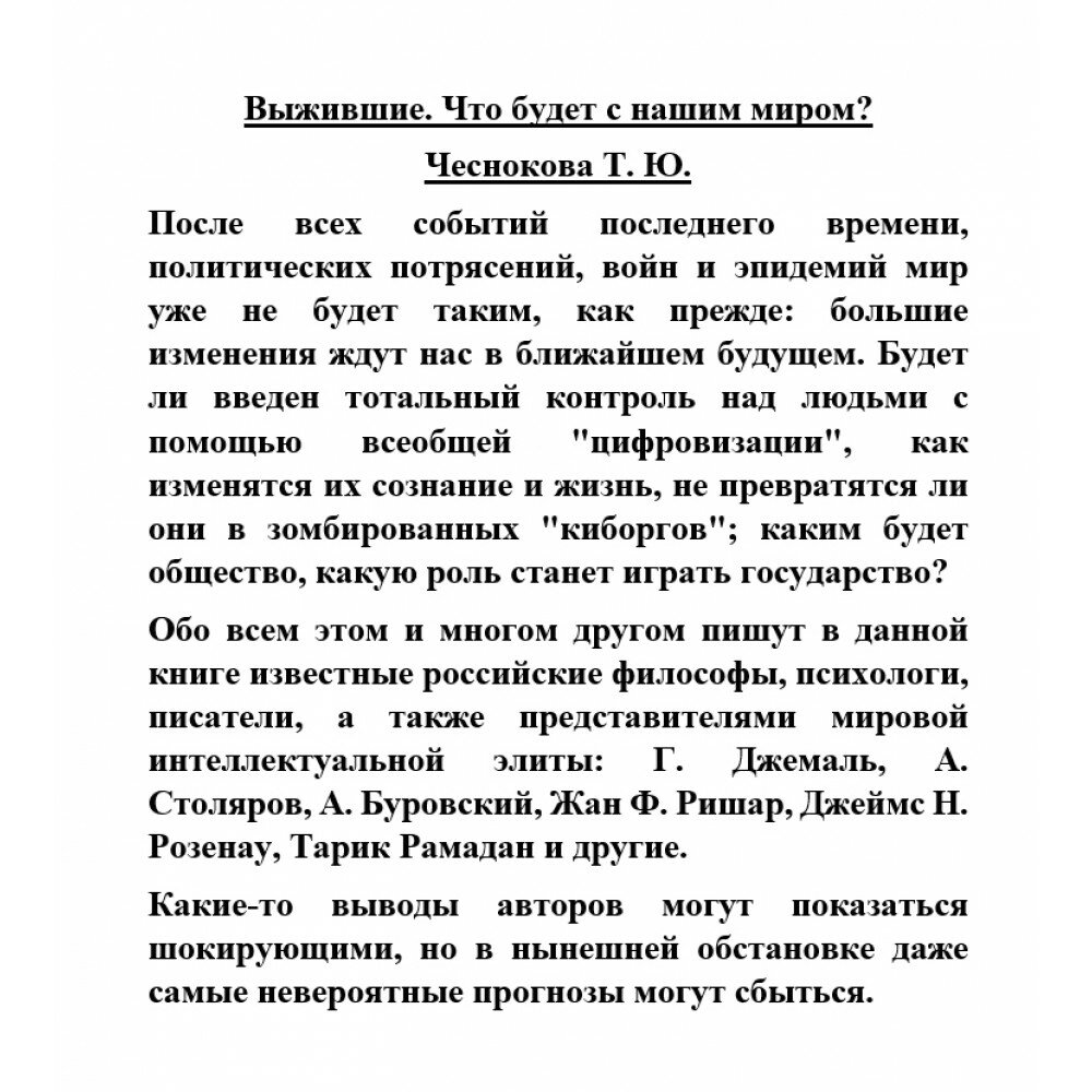 Сервис сравнения цен СкидкаГИД предлагает сравнить цены на товар «Книга: Выжившие. Что будет с нашим миром? (Татьяна Чеснокова); Алисторус, 2022»