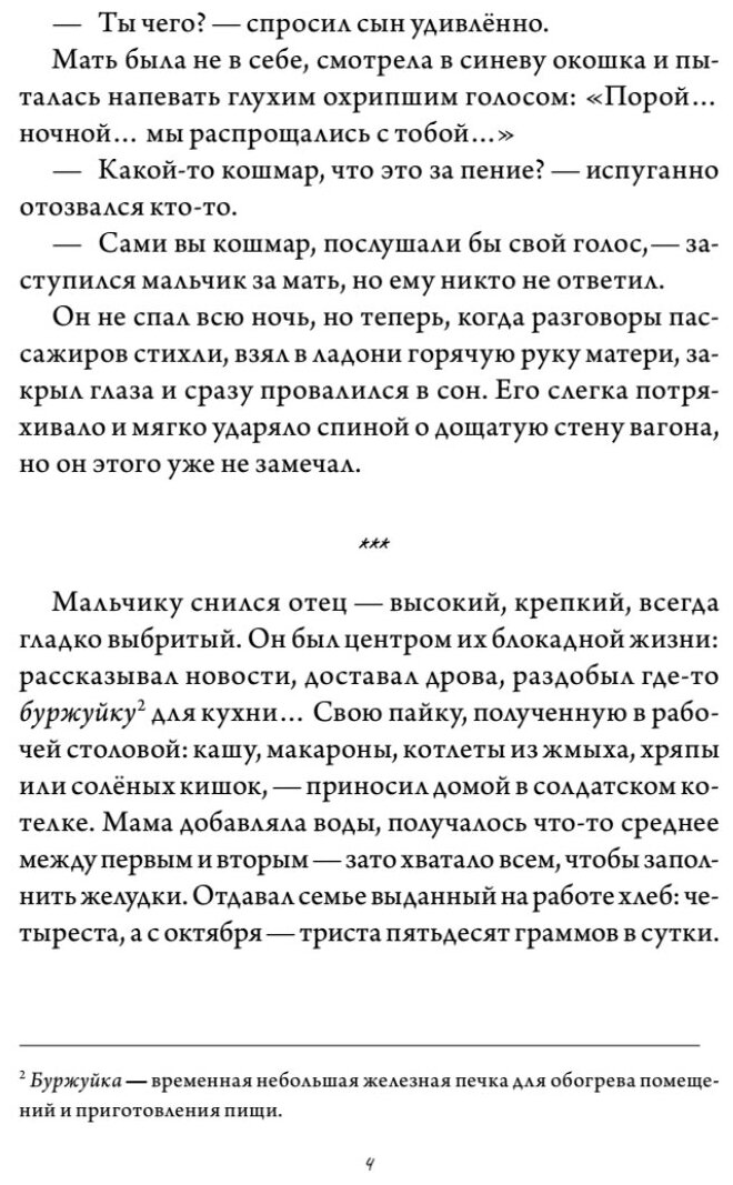 По-моему, эта повесть не подойдёт современным подросткам. Во-первых, проиллюстрирована неизвестно какими (и неизвестно чьими) фотографиями. Во-вторых, хоть в примечаниях к этому изданию и поясняется, что такое буржуйка, что такое теплушка, но не поясняется переименование городов - например, Санкт-Петербург упорно называется Ленинградом. "А что такое Ленинград? А что такое Свердловск? И что такое милиция?". В-третьих, произведение - наверняка в духе "чтива на один раз" (перечитывать не потянет). В-четвёртых, на 144 страницах [самой книги] не уместились содержание и выходные данные - то и другое пришлось разместить на обороте форзацев. Кстати, в содержании нет "главы 1", "главы 2" - если ты дочитываешь до конца главы номер такой-то, то нужное место или запоминай, или закладывай. ...На замечание кого-то, что эта повесть - не вполне ленинградская, несмотря на подзаголовок, я отвечу: ленинградский колорит - вполне есть. И упоминание о некоторых достопримечательностях (вроде Смольного), и намёк на блокаду,.. А вот то, что любая война ужасна - да, прослеживается.