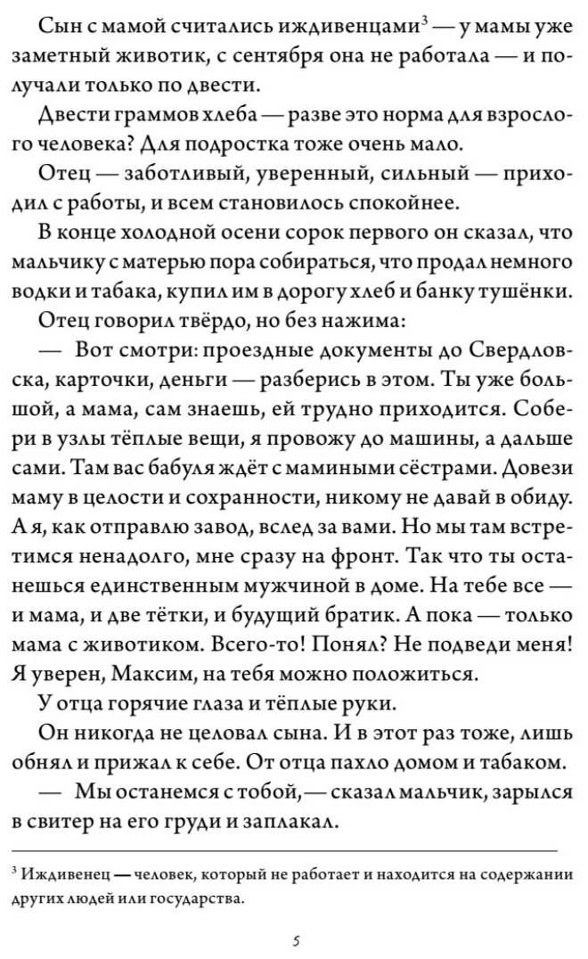 С какой стороны ни рассматривать войну - это всегда страшно. Это ужас, о котором нам повезло лишь слышать и читать, но даже так он наводит страх, описанные события трогают до мурашек и нам кажется, что с нами такого никогда не произойдет, потому что.. ну а как такое может произойти? Вот и людям, которые спокойно жили свои жизни в 1941 казалось, что война еще далеко, что ее просто не может быть. Сейчас мы знаем, что может. В этой книге про войну рассказывают дети, самые чистые, которые точно не заслужили ничего такого. На первоклассника Максима, - главного героя истории, резко взвалилась большая ответственность. Семилетний мальчик больше не мог оставаться ребенком, ему пришлось вырасти. Его отец ушел на войну, и оставил на него мать на сносях, и поручение довезти себя, маму и будущего брата до родственников. Маленький мальчишка остался единственным мужчиной в семье. Тогда жизнь каждого ребенка изменилась, каждого мальчика в особенности, они больше не могли оставаться мальчиками, просто не могли. Эта тяжелая история про сильного мальчика, который в итоге стал мужчиной, хоть и слишком рано. Слова отца вынуждали Максима не сдаваться, он мог подвести отца и должен был спасти, в итоге, себя и брата.