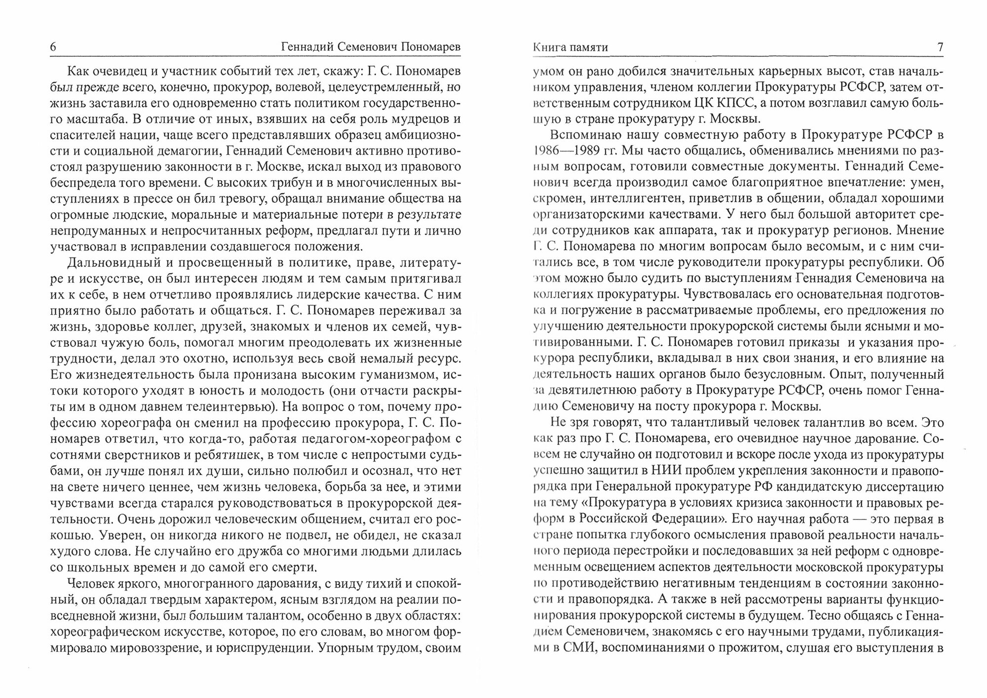 Книга подготовлена организацией ветеранов прокуратуры г. Москвы и посвящена памяти Геннадия Семеновича Пономарева, известного и уважаемого правоведа, почти 50 лет успешно служившего на благо Москвы и москвичей. Особенно его высокие профессиональные и личные качества проявились на посту прокурора г. Москвы в 1989-1995 гг., а затем в течение 15 лет в качестве начальника Государственно-правового управления Правительства Москвы. Г. С. Пономарев внес большой вклад в укрепление законности и правопорядка в городе, в улучшение деятельности представительных и исполнительных органов власти столицы. Представлены воспоминания коллег и друзей, ветеранов органов прокуратуры и Правительства Москвы, труды Г. С. Пономарева, фотографии и другие документы из архива его семьи и сослуживцев.