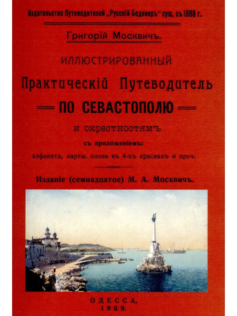 Репринт с издания. Одесса 1909. С приложением: алфавита, карты окрестностей, плана Севастополя в 4-х красках и проч. Издание 17. Москвич Григорий Георгиевич (1860, Ялта - 1942 там же) В 1888 году основал издательство путеводителей. Всего им было выпущено 15 путеводителей, которые вместе выдержали 223 издания. Он в начале XX века переехал в Санкт-Петербург. Здесь Г. Москвич основал издательство "Русский Бедекер". Г. Москвич был одним из первых туристических операторов России. Он организовывал туристические поездки на теплоходах, поездах, автомобилях, верховых лошадях, пешие походы (в которых сам принимал участие). Создал первые экскурсионные бюро на Кавказе. Путеводители, изданные нами: Иллюстрированный практический путеводитель по Крыму (2 издания: в обычном формате и карманном с другого издания); Иллюстрированный практический путеводитель по Севастополю и окрестностям; Иллюстрированный практический путеводитель по Черноморскому побережью; Иллюстрированный практический путеводитель по Москве; Путеводитель по курортам Кубани и Черноморья.