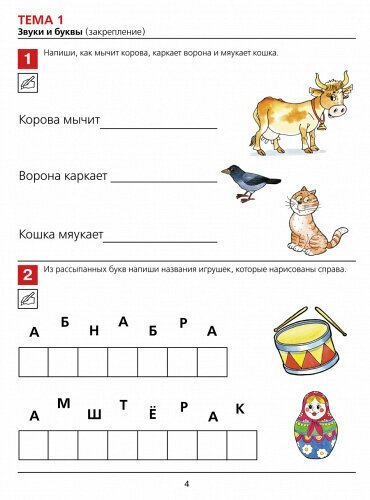 В тетради детям предлагаются игровые обучающие задания со звуками и буквами, разгадывание ребусов и кроссвордов, чтение пословиц и поговорок. В процессе выполнения заданий у ребёнка формируются предпосылки учебной деятельности: понимание учебной задачи, умение решить её самостоятельно, с помощью взрослого провести самоконтроль. Задания, предлагаемые в пособии, способствуют обогащению словарного запаса, формированию грамматически правильной речи, закреплению знаний об окружающем мире.