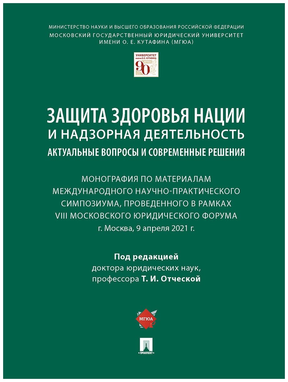 Настоящая монография представляет собой научно-исследовательскую работу, в которой собраны выступления и статьи участников Международного научно-практического симпозиума на тему «Зашита здоровья нации и надзорная деятельность: актуальные вопросы и современные решения», состоявшегося 9 апреля 2021 г. в Московском государственном юридическом университете имени О. Е. Кутафина (МГЮА), в рамках VIII Московского юридического форума.