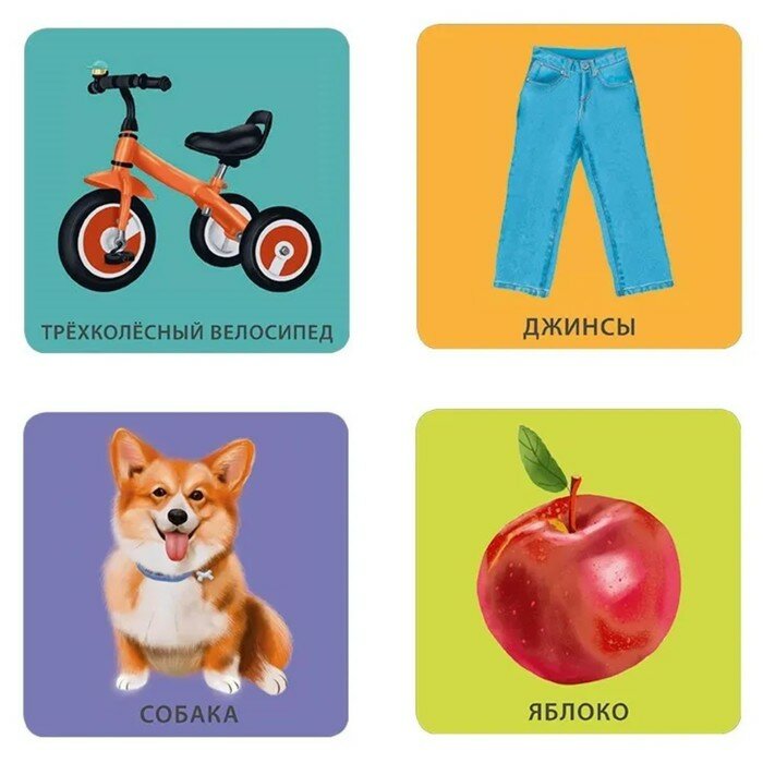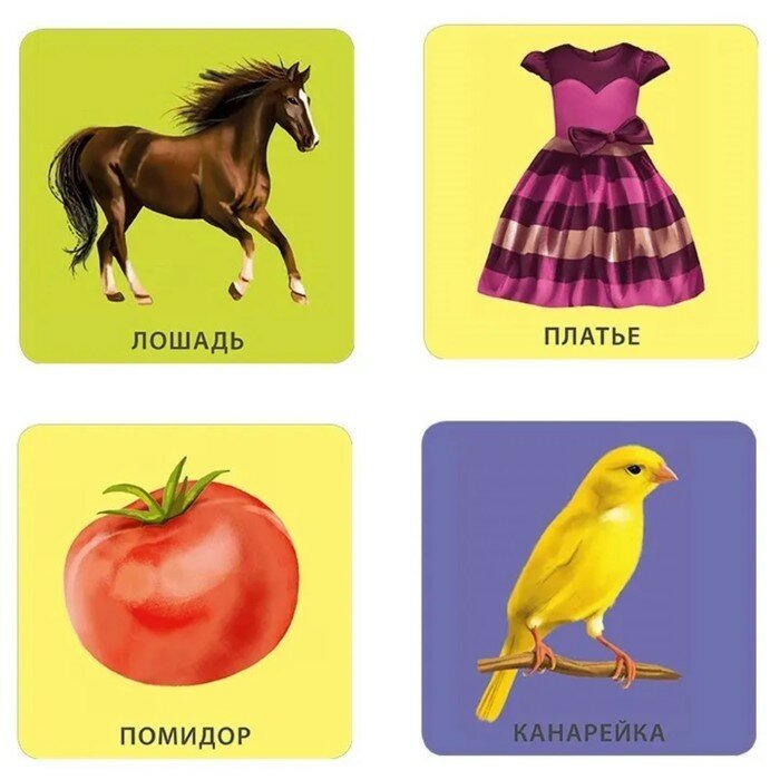 - Каждая карточка – это яркая картинка на цветном фоне и подпись к ней с каждой стороны.