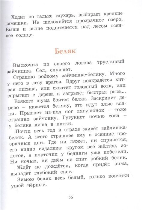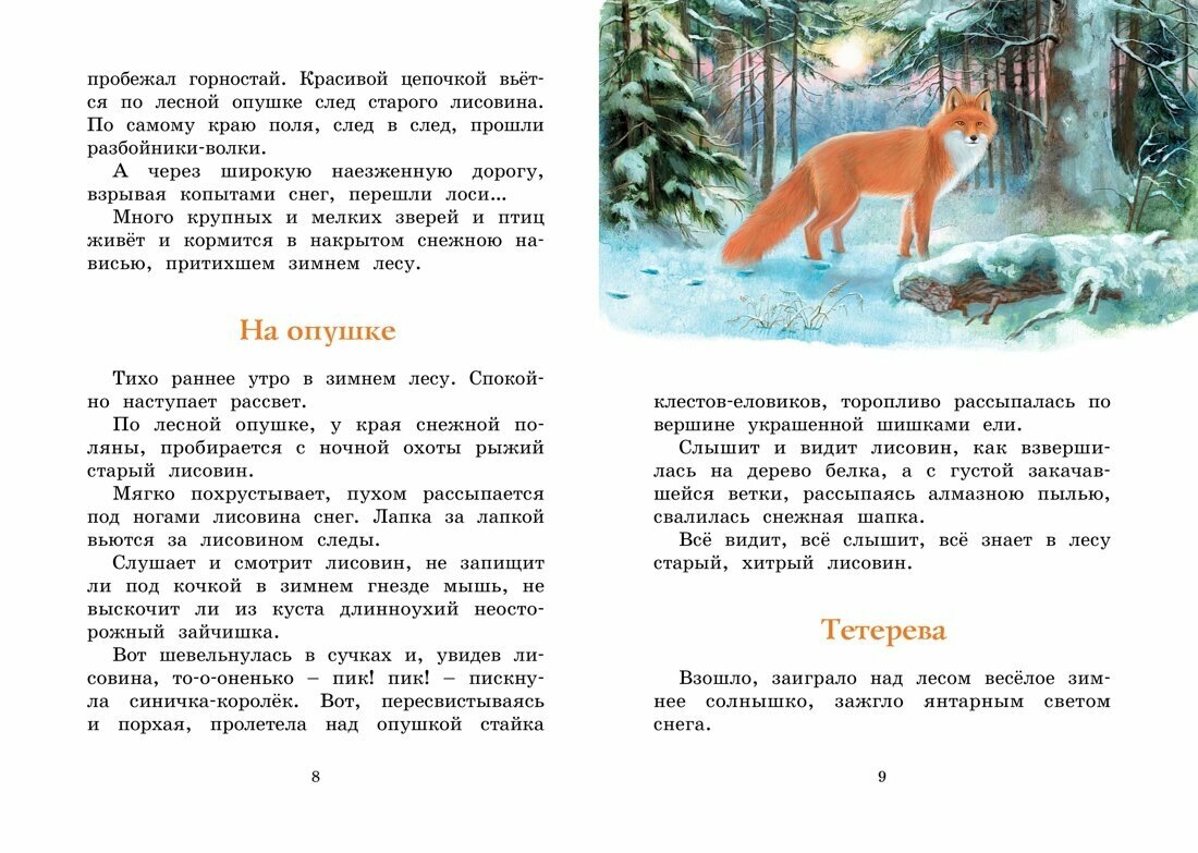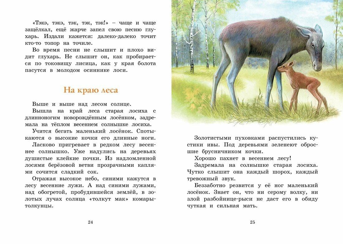 Книга написана красивым языком. Через простые и ясные небольшие рассказы ребенок познакомится с жизнью обитателей леса. Разделенные по временам года рассказы составляют целый цикл повествований о животных и птицах, также представлены дополнительные рассказы о природе. Книга прекрасно проиллюстрирована, печать крупная,ясная, подойдёт для самостоятельного чтения, а также для чтения вслух малышам. Читая эти рассказы,получаешь истинное удовольствие от необыкновенного живого языка автора. Многие тексты можно использовать в качестве тренировочных материалов для изложения и диктантов по русскому языку. Книгу однозначно рекомендую к покупке! Качество печати хорошее, обложка полутвердая, формат удобный.