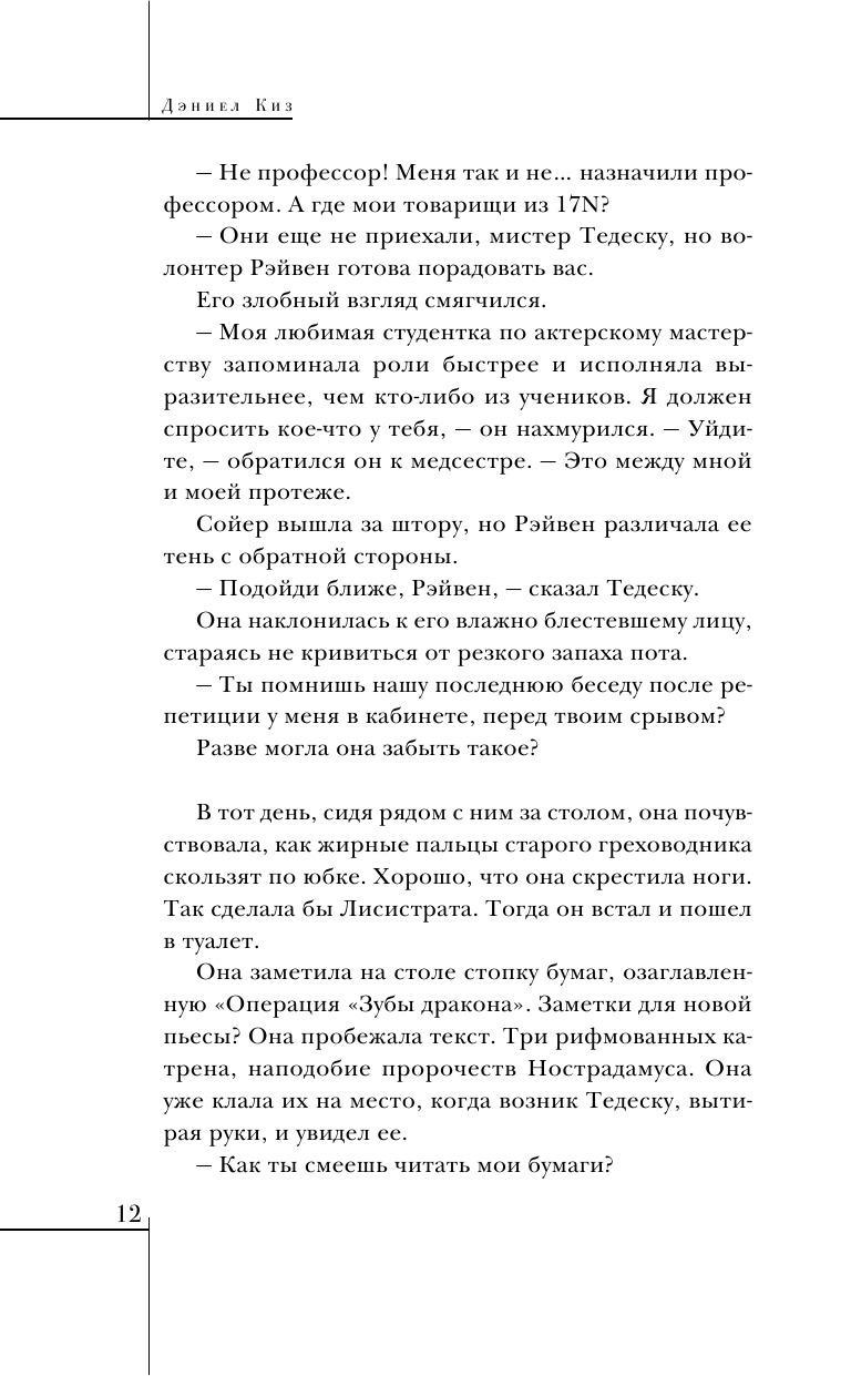 Завязка цепляющая, читателя сразу забрасывают в стремительно развивающийся сюжет романа и оставляют разбираться самому с персонажами и их жизнями. Очень динамично, много диалогов, действия, неожиданных поворотов. Киз то и дело подбрасывает крючки, заставляющие читать дальше. В голове только “что произошло?” и “что будет дальше?”. Автору снова удалось реалистично передать ход мыслей персонажа с психическим расстройством, без фальши и перегибов. Концовка порадовала, я бы даже назвала ее хэппи-эндом, хотя в рамки традиционного понимания хорошего финала она не вписывается.